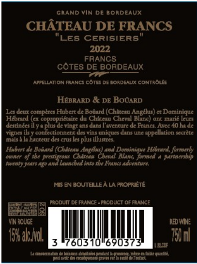| Libellé | CHATEAU DE FRANCS, 2022 - Côtes de Bordeaux AOP - Rouge - 75 cl |