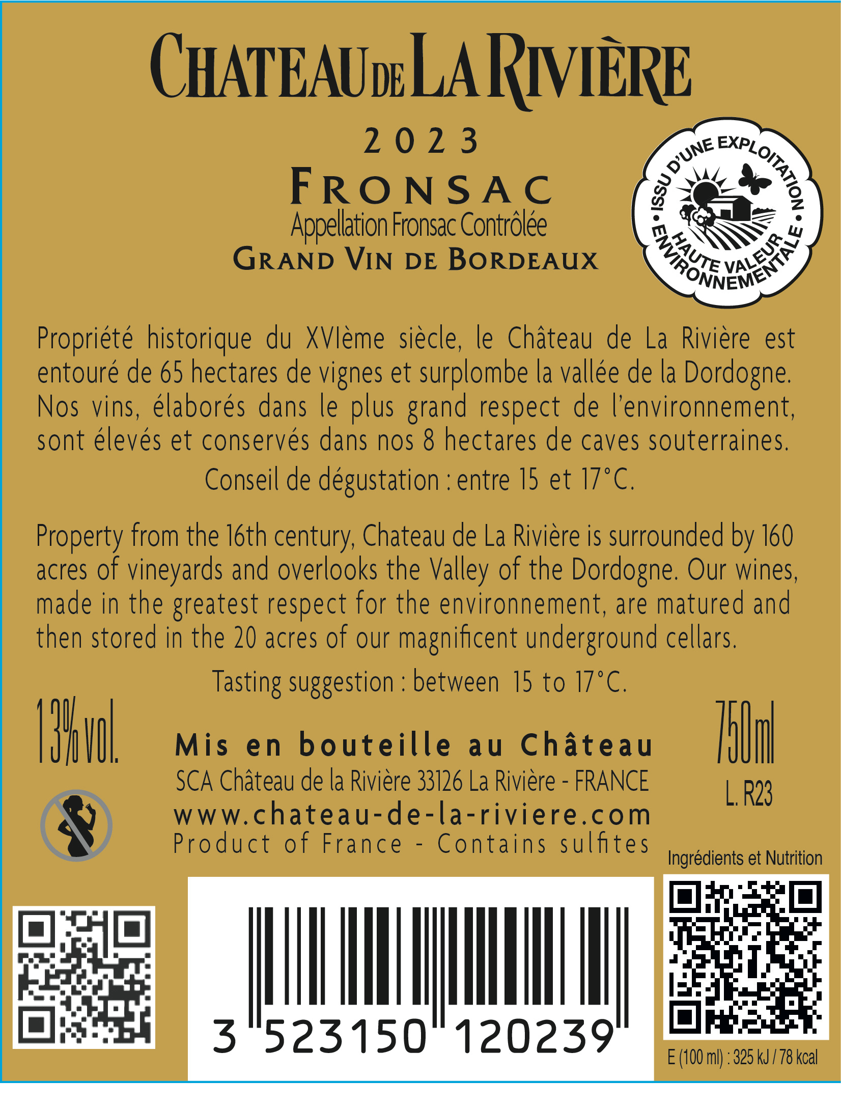 | Libellé | Chateau de la riviere, 2023 - Fronsac AOP - Rouge - 75 cl |