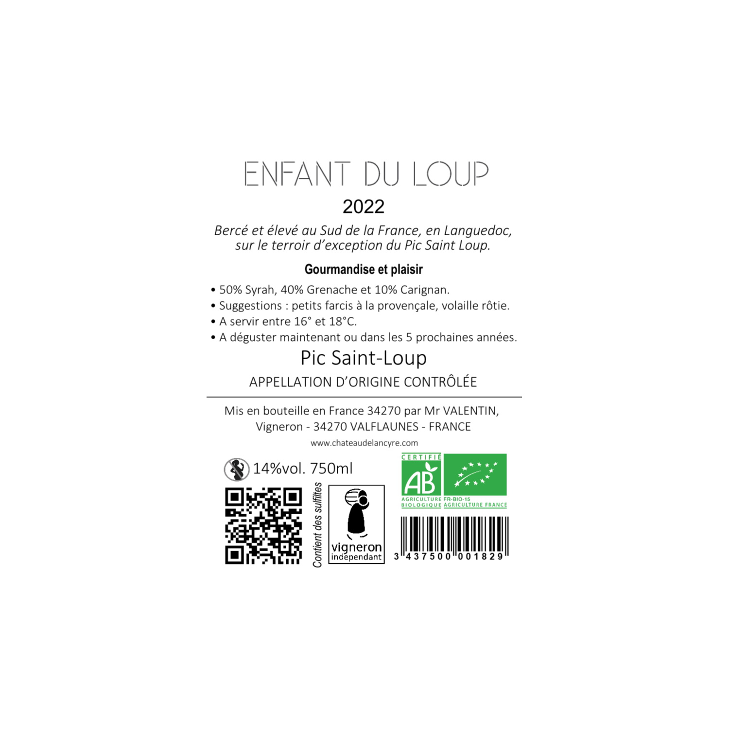 | Libellé | Château de Lancyre Enfant du Loup BIO, 2022 - Pic-Saint-Loup AOP - Rouge - 75 cl |