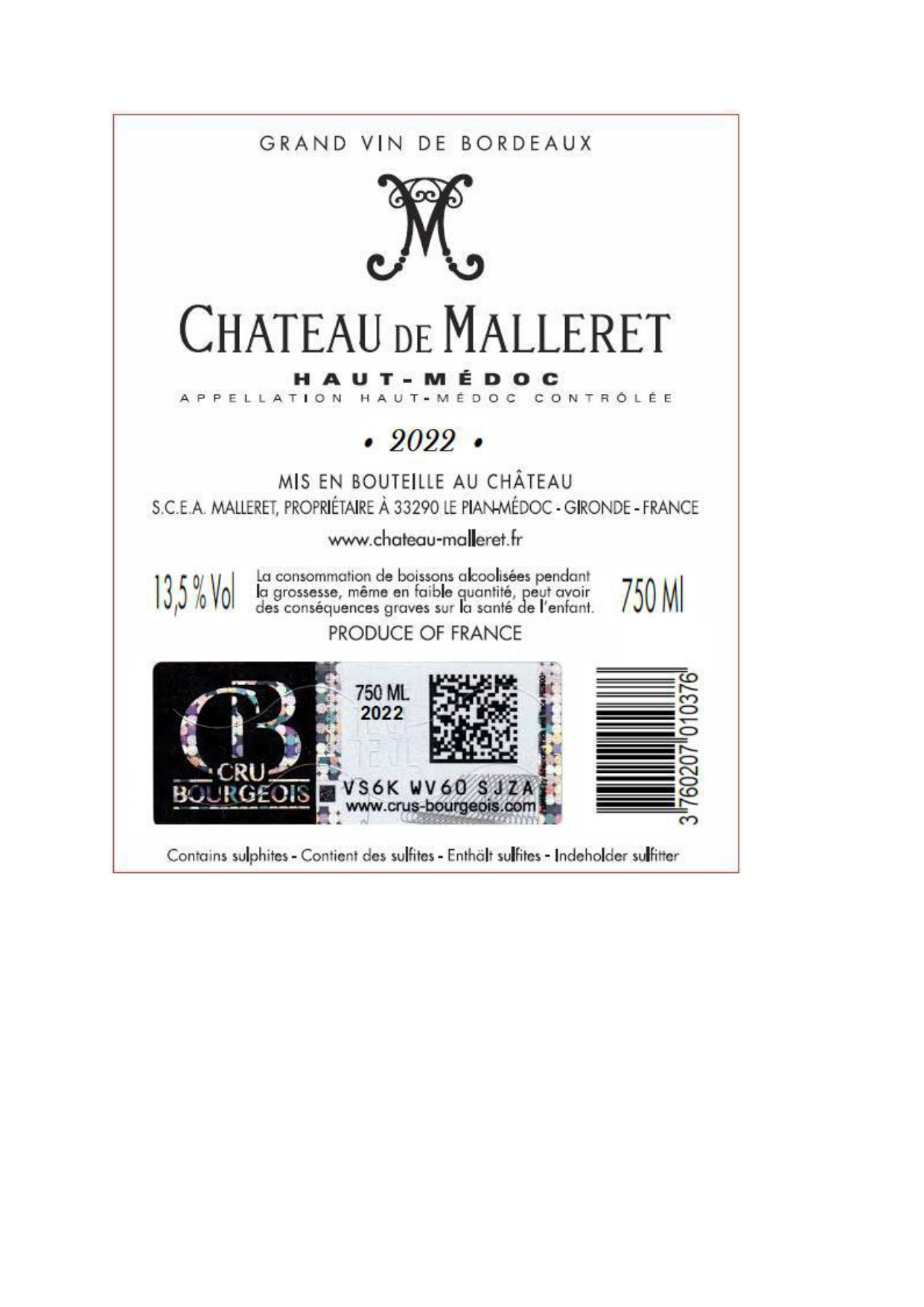 | Libellé | Château de Malleret, 2022 - Haut-Médoc AOP - Rouge - 75 cl |