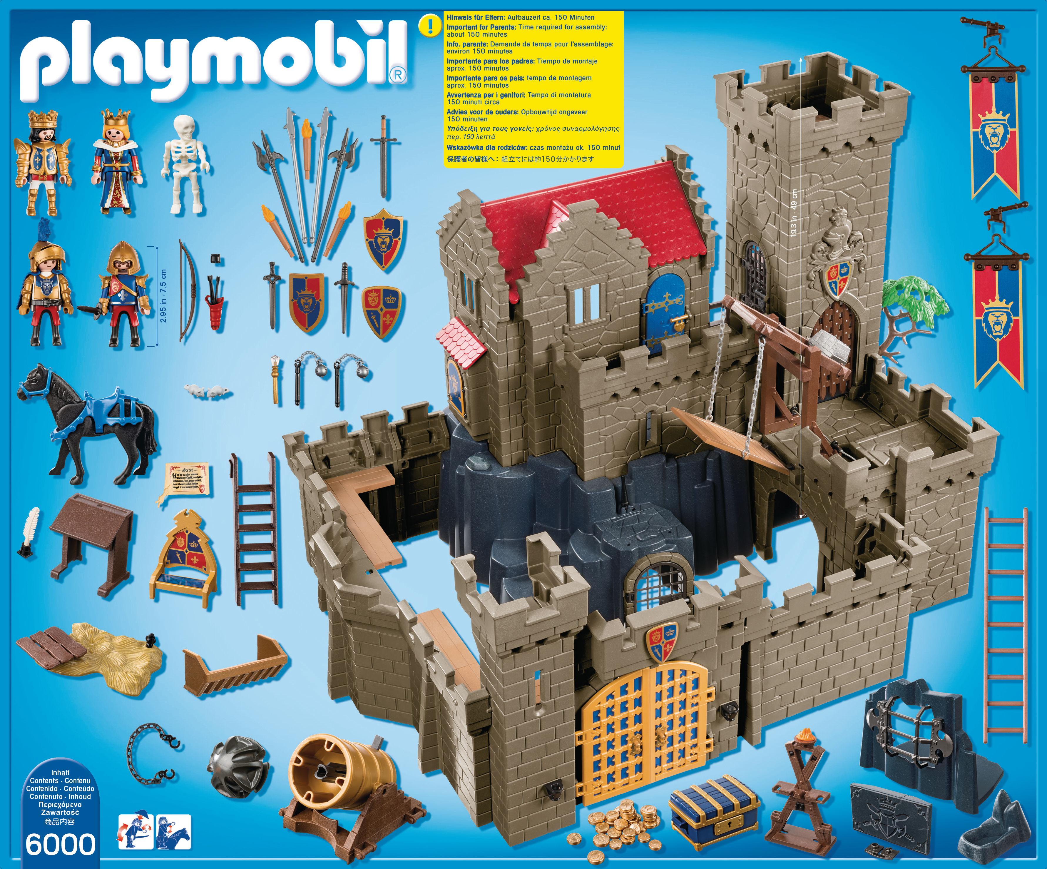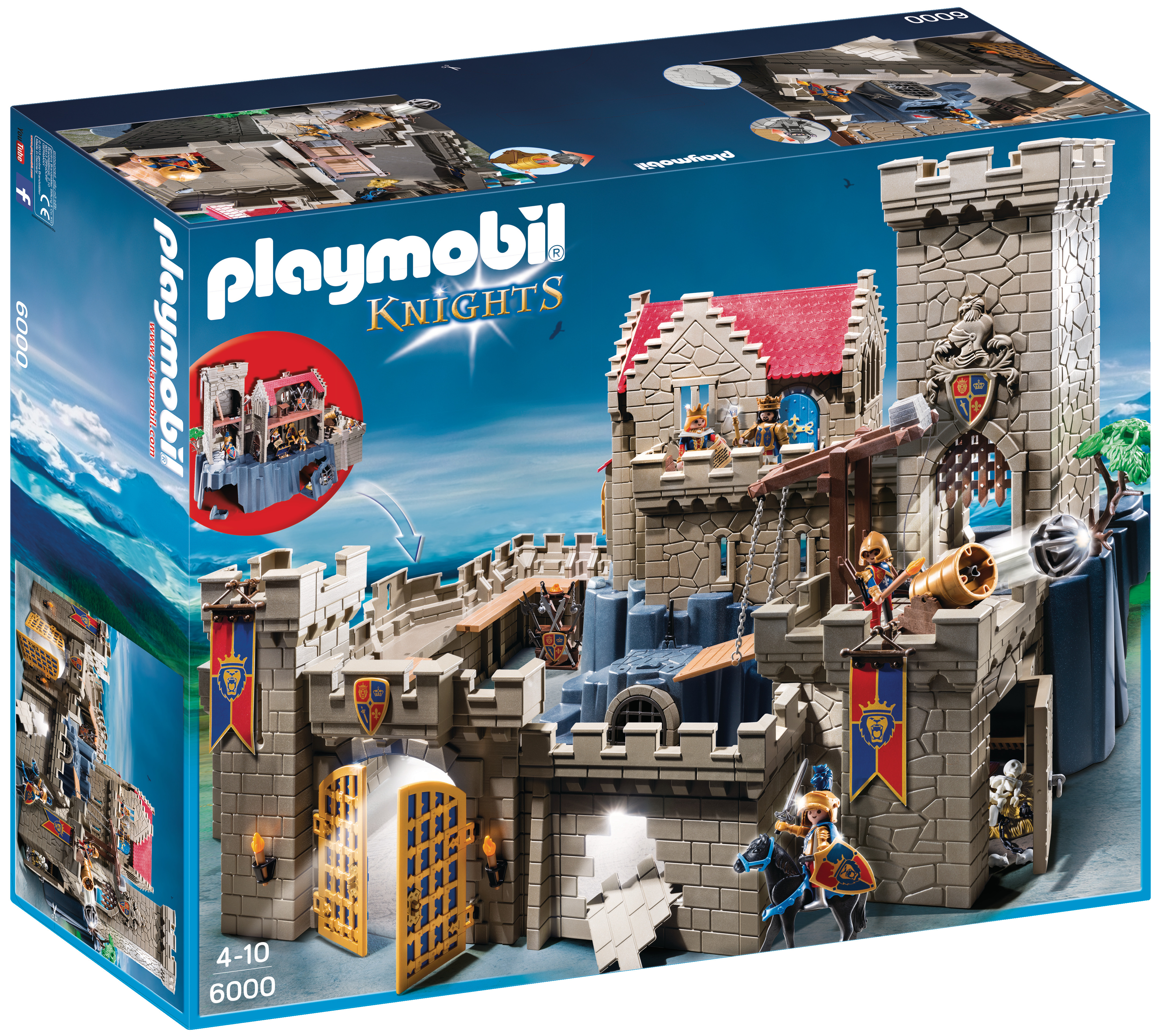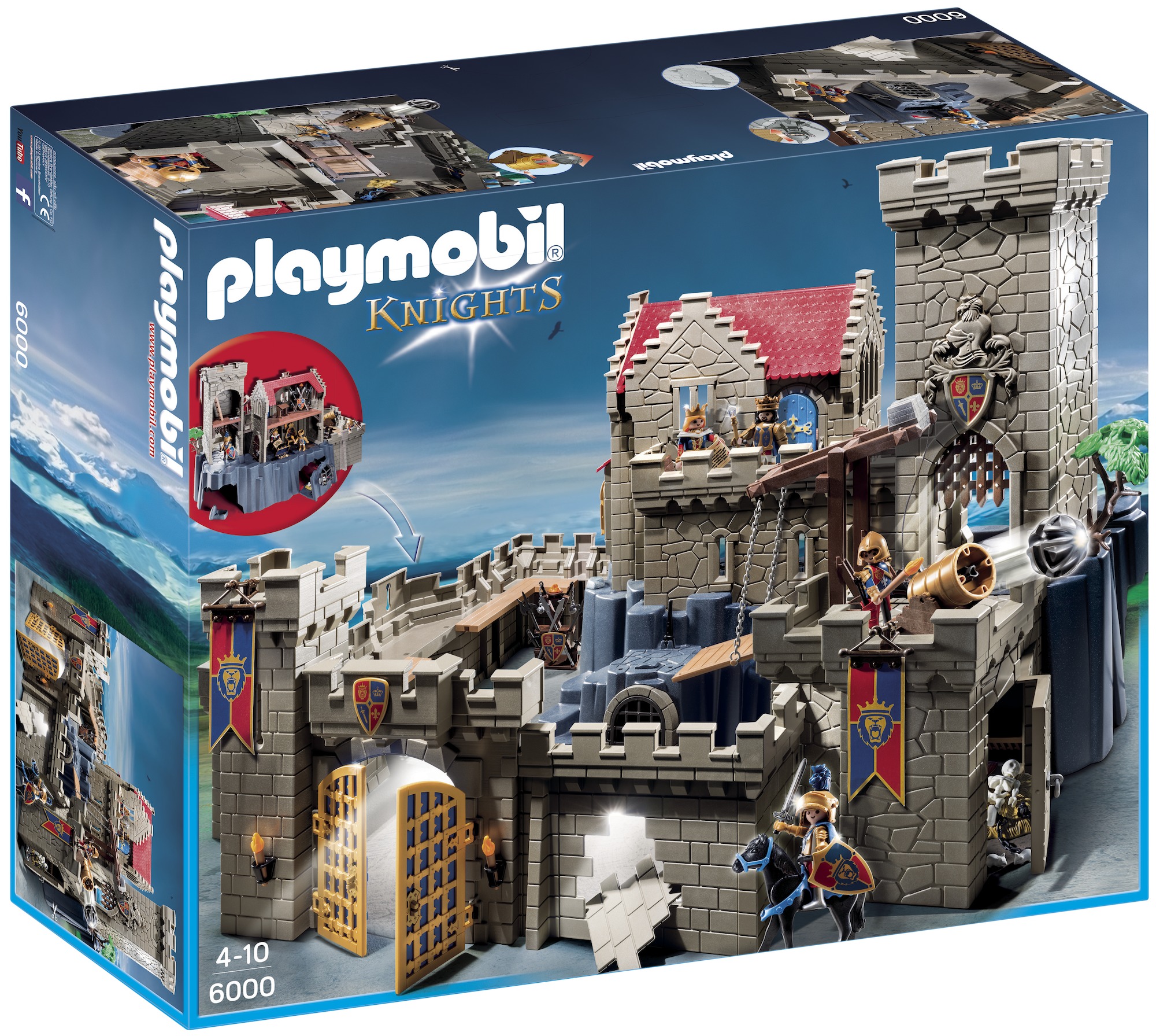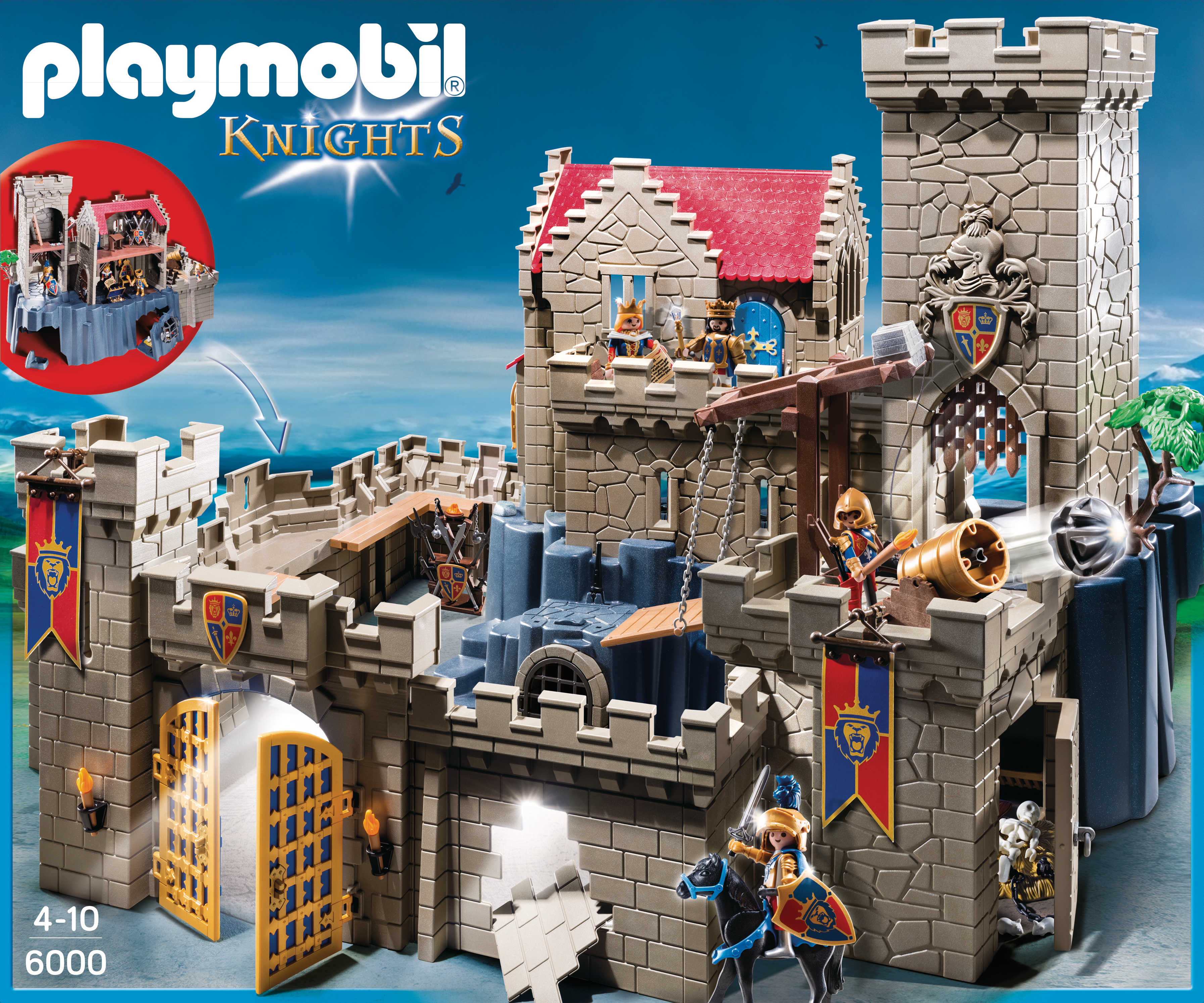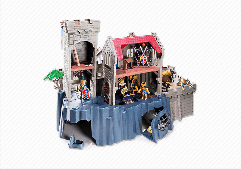 La boîte contient Contient 4 personnages, 1 grand château avec tours, des animaux (cheval, souris), des armes (épées, canon, ) et de nombreux accessoires (trône, coffre, squelette, escaliers, fanions ). Le canon tire des projectiles, le mur est cassable, la tour comporte une trappe, le pont basculant se lève et la herse s'abaisse.