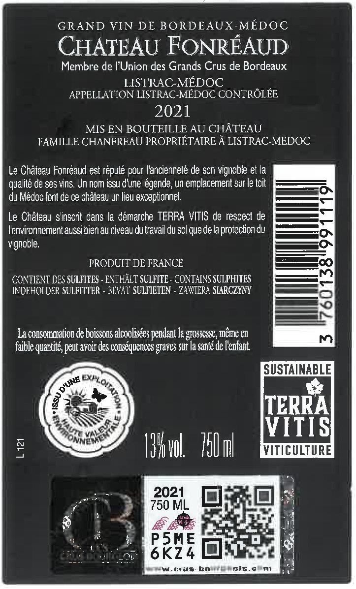 | Libellé | Château Fonréaud, 2021 - Listrac-Médoc AOP - Rouge - 75 cl |