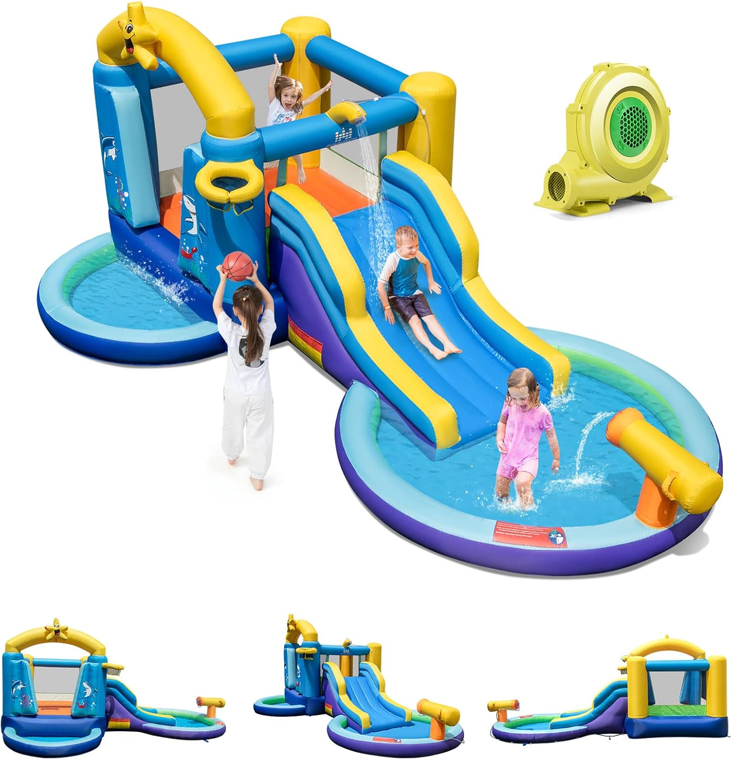 Château gonflable avec souffleur 680w, parc aquatique océan avec toboggan, panier de basket et trampoline