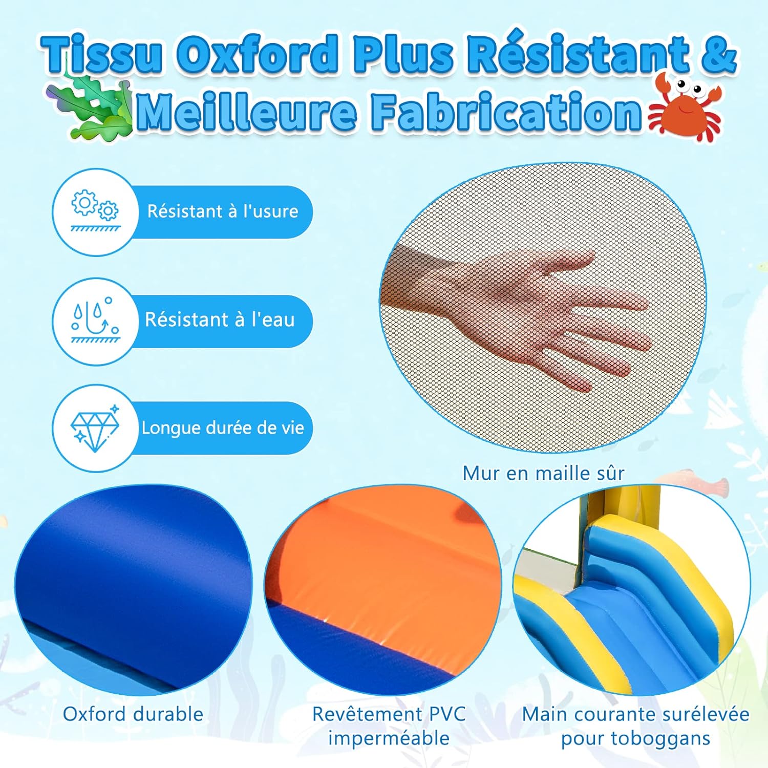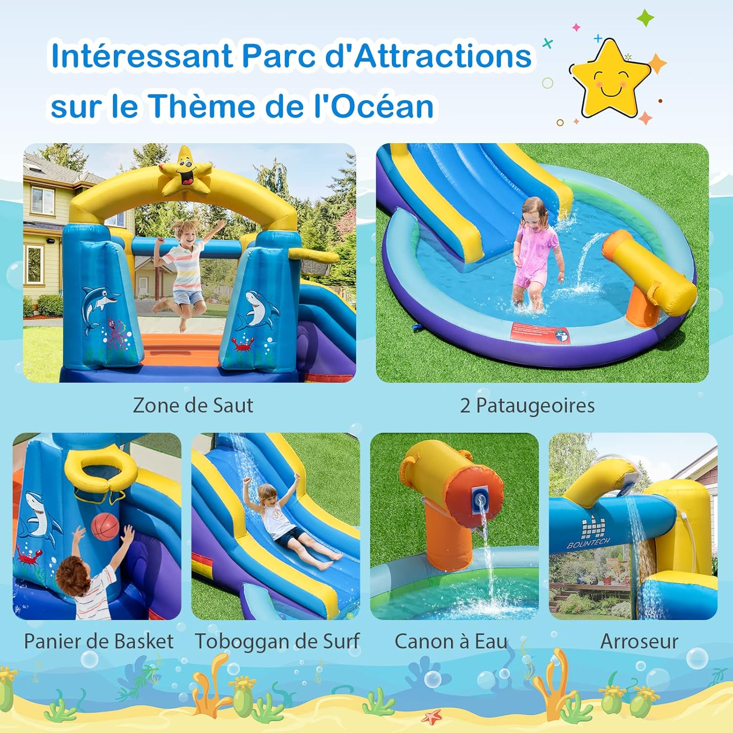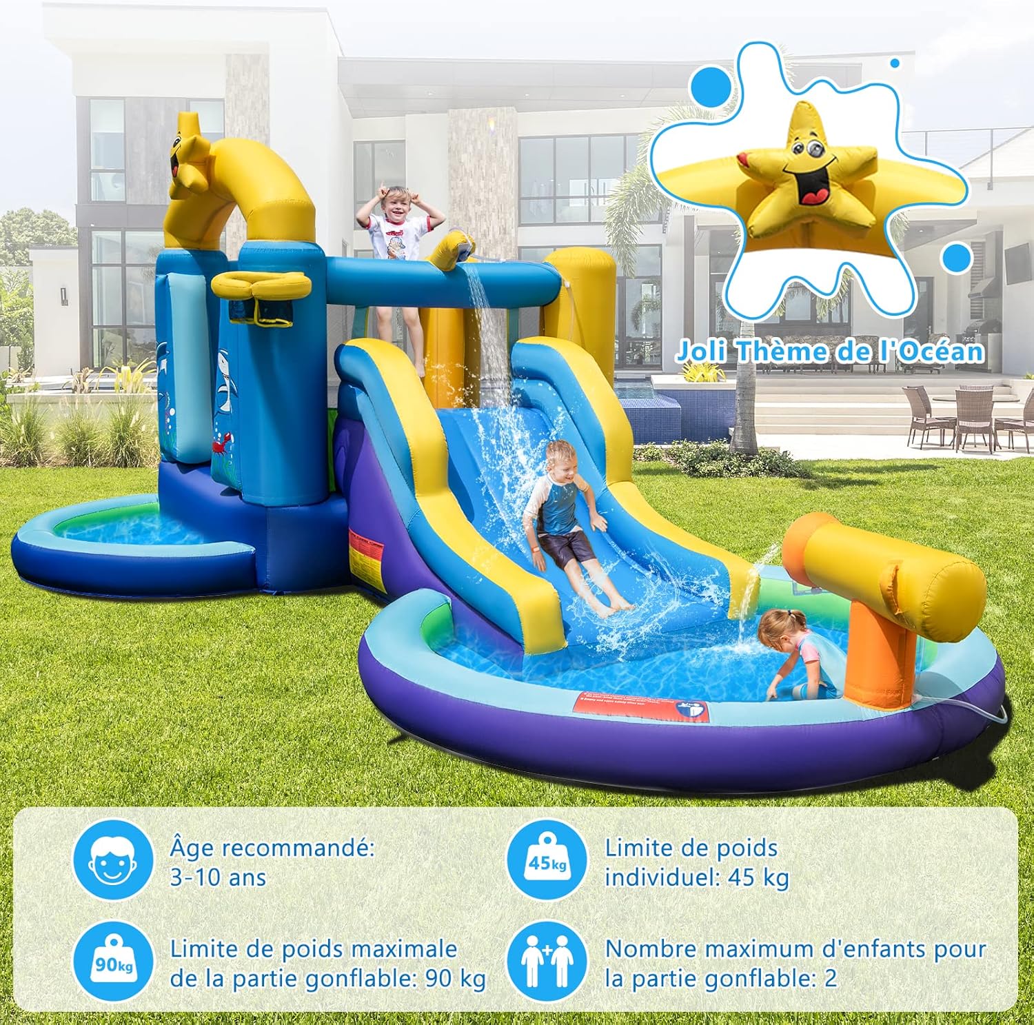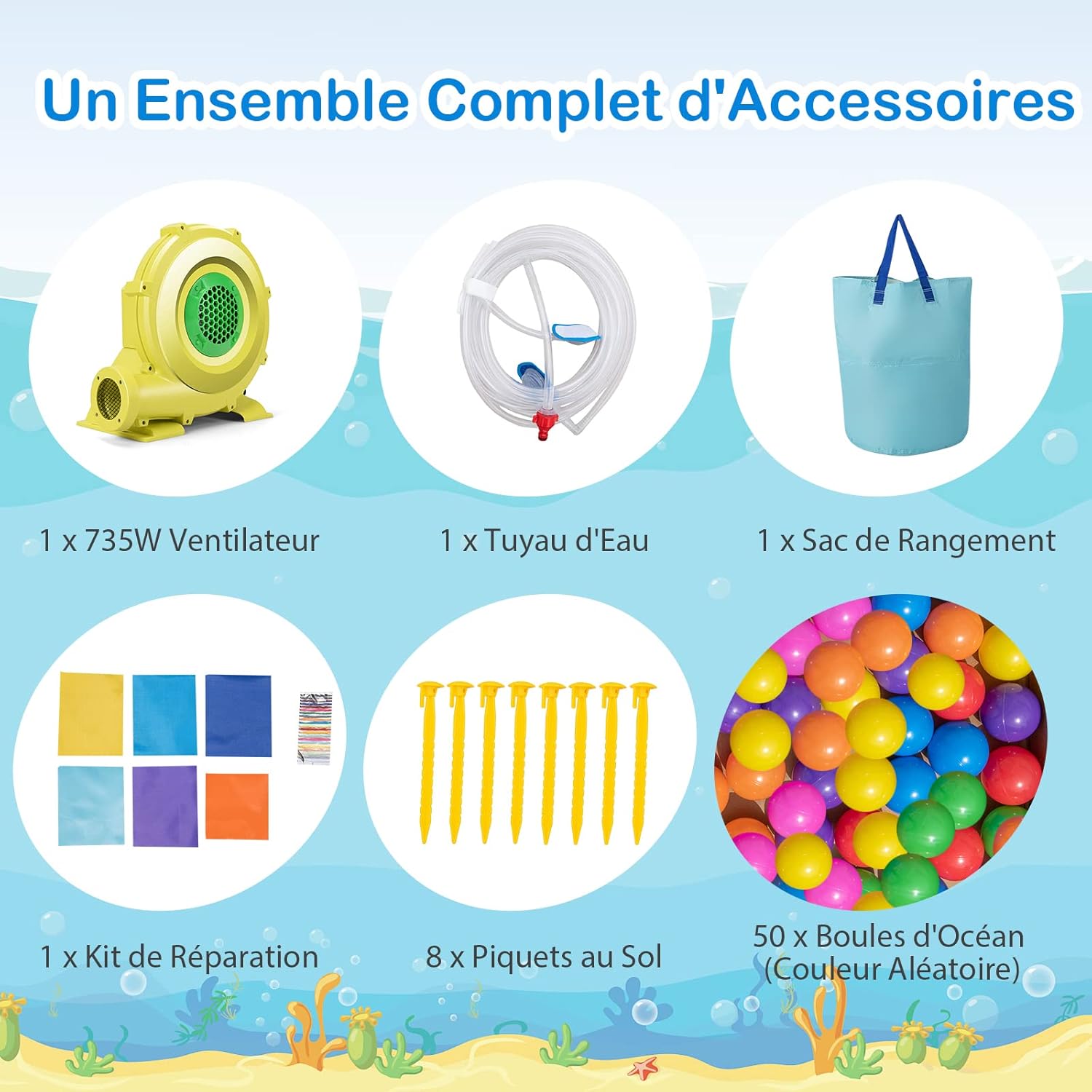 - Cadeau Idéal pour Enfants : Le château gonflable est le cadeau idéal pour votre enfant. Les jolis motifs de l'océan attirent l'attention des enfants et les incitent à jouer à l'extérieur. Le château gonflable permet également à votre enfant d'exercer sa coordination corporelle et de renforcer ses muscles.