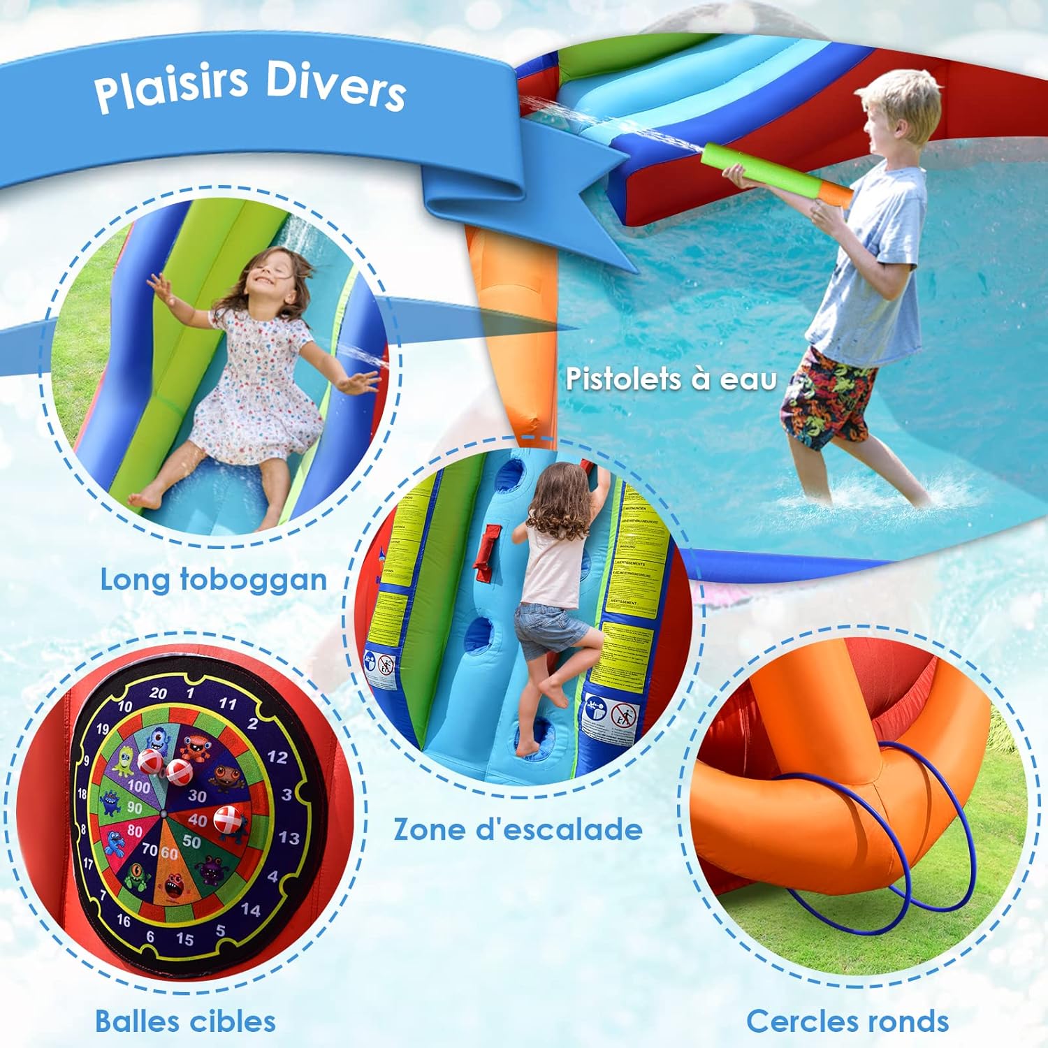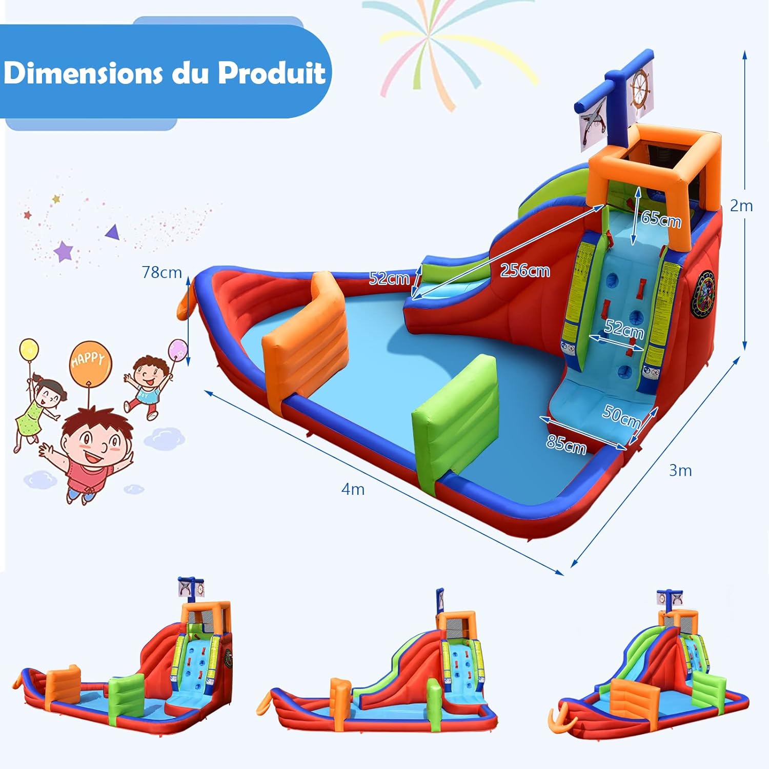 | Libellé | Château gonflable bateau pirate, aire de jeux gonflable aquatique avec zone d’escalade, toboggan, pistolets à eau, accessoires riches |
