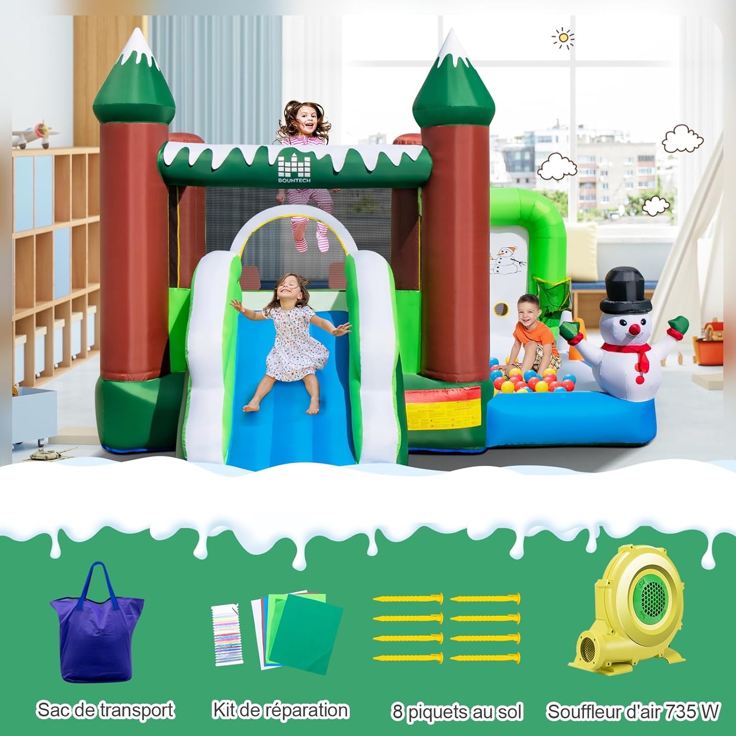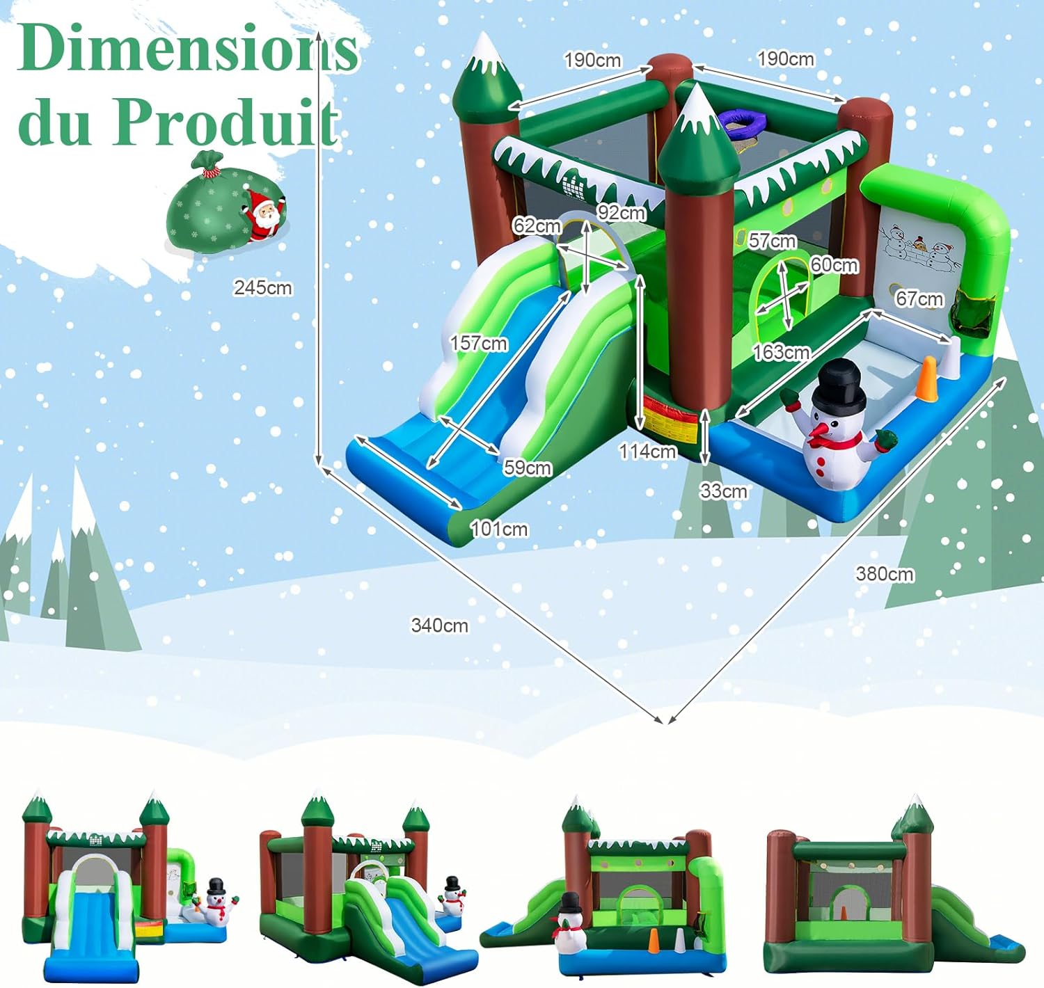 Ce château gonflable est conçu sur le thème hivernal, avec un adorable bonhomme de neige. Il se compose d'un toboggan lisse, d'une zone de saut spacieuse et d'une grande piscine à balles. Les enfants de 3 à 10 ans peuvent jouer à des jeux, comme le lancer des balles, le lancer des anneaux ou tirer des balles. Les murs en maille et les garde-corps surélevés les protégeront pendant le jeu. Le tissu Oxford enduit de PVC résistant aux déchirures garantit sa durabilité. Le colis comprend un ventilateur électrique, un sac de transport, un kit de réparation et 8 piquets de sol pour plus de commodité.