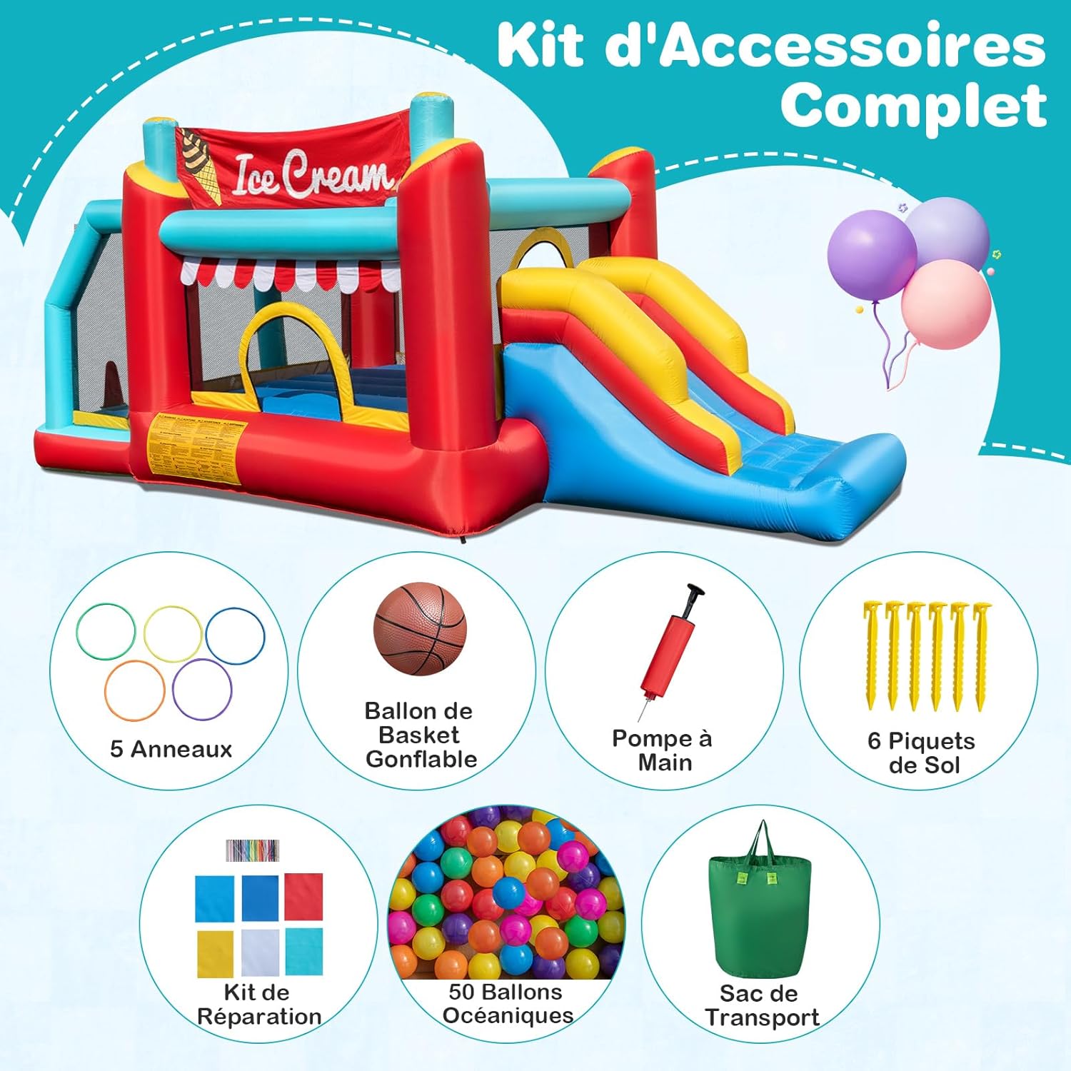 - Accessoires complets : Nous vous livrons avec ce produit 50 balles océaniques colorées, un panier de basket, 5 anneaux et une pompe à main. Le sac de transport fourni facilite le stockage du château lorsqu’il n’est pas utilisé, et le kit de réparation apporte plus de commodités.
