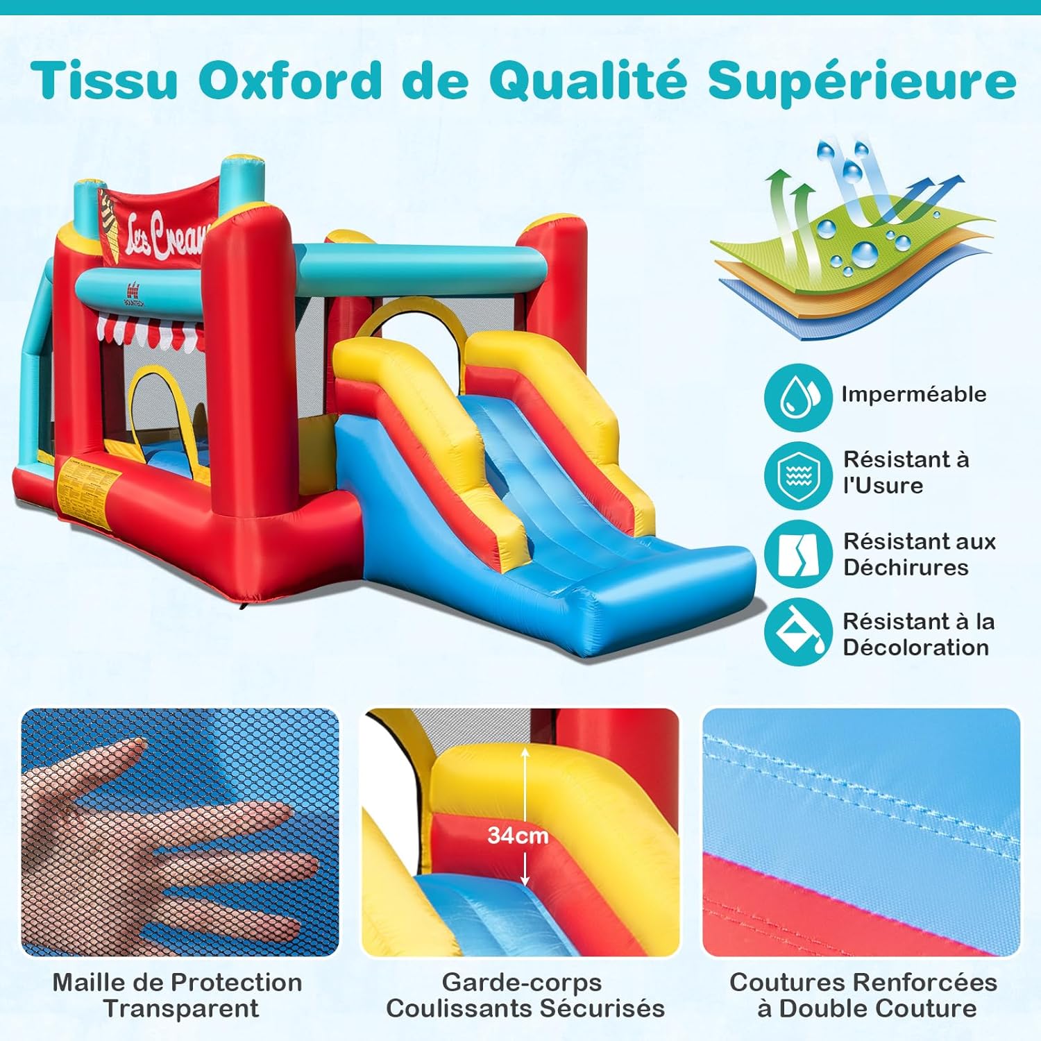 Notre château gonflable pour enfant dispose d’un toboggan, une maison de rebond, une piscine à balles, un panier de basket et un jeu de lancer d’anneaux, permettant aux plusieurs enfants de s’amuser en même temps. Le tissu Oxford de qualité supérieure assure une utilisation à long terme, et les coutures doublement renforcées garantissent une excellente résistance à la déchirure.