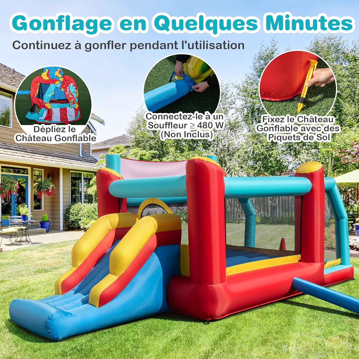 - Multiples divertissements de jeu : Notre château gonflable pour enfant dispose d’un toboggan, une maison de rebond et une piscine à balles, permettant aux plusieurs enfants de s’amuser en même temps. Il est équipé également de multiples divertissements tels que panier de basket et jeu de lancer d’anneaux, ce qui ajoute plus des plaisirs.