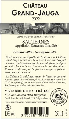 | Libellé | Château Grand Jauga Cuvee Prestige, 2022 - Sauternes AOP - Blanc Doux - 75 cl |