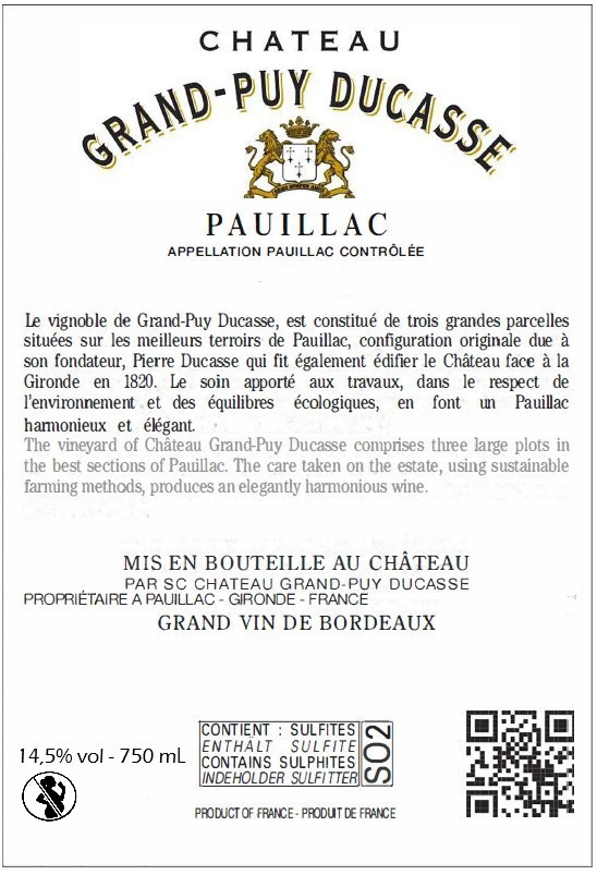 | Libellé | Château Grand-Puy Ducasse, 2022 - Pauillac AOP - Rouge - 75 cl |