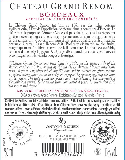 | Libellé | Château Grand Renom, 2021 - Bordeaux AOP - Rouge - 75 cl |