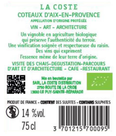 Libellé Château la Coste BIO, 2022 - Coteaux d'Aix en Provence AOP - Rouge - 75 cl