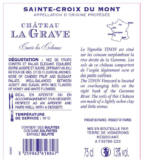 | Libellé | Château La Grave - Cuvée les Coteaux, 2023 - Sainte-Croix-du-Mont AOP - Blanc Sec - 75 cl |