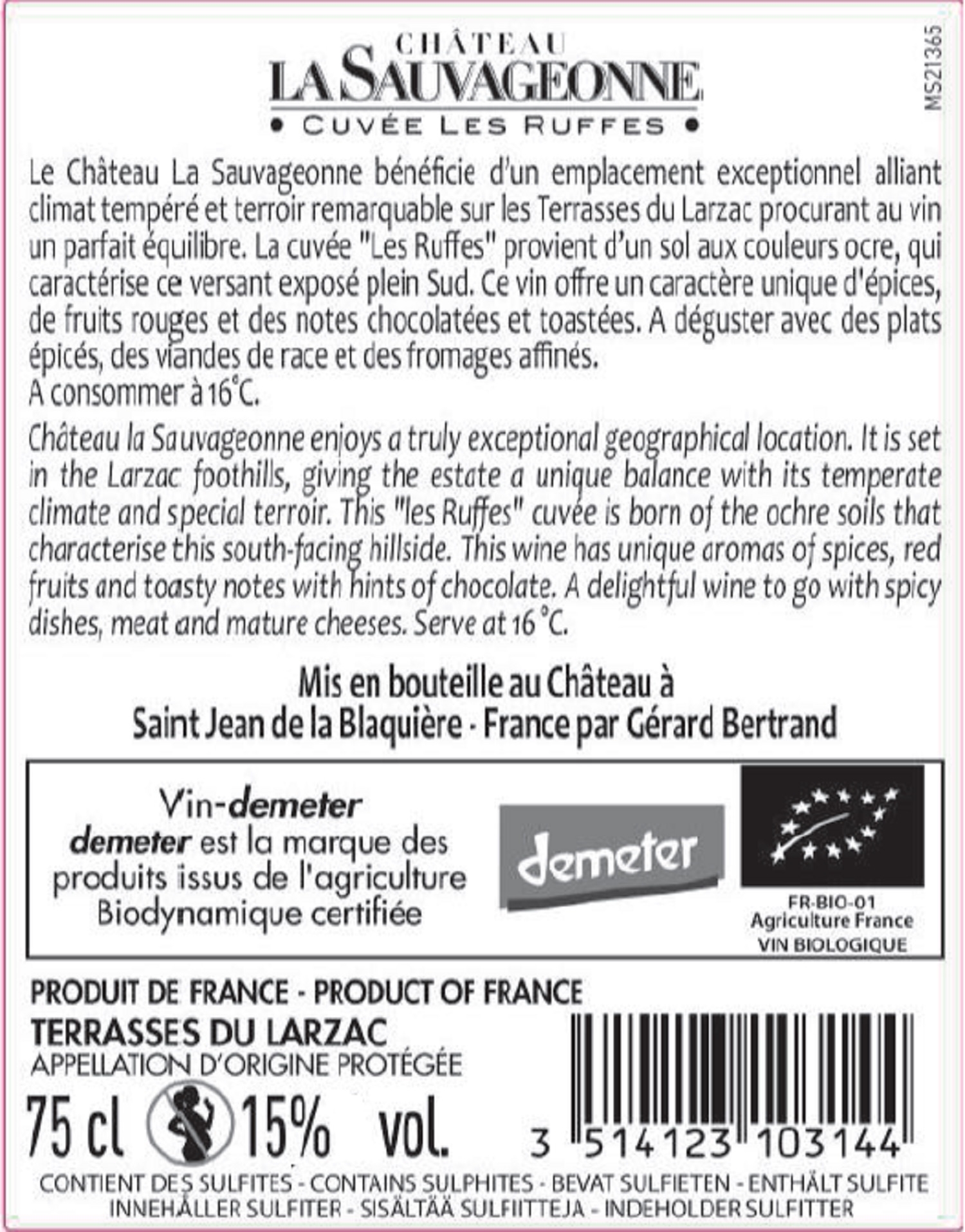| Libellé | Château la Sauvageonne Les Ruffes BIO, 2019 - Terrasses du Larzac AOP - Rouge - 75 cl - étiquette abîmée |