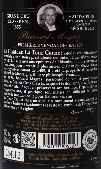 | Libellé | Château La Tour Carnet , 2022 - Haut-Médoc AOP - Rouge - 75 cl |