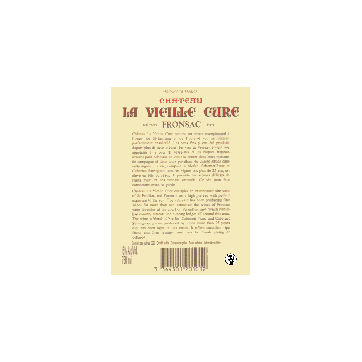 | Libellé | Château La Vieille Cure, 2020 - Fronsac AOP - Rouge - 75 cl |