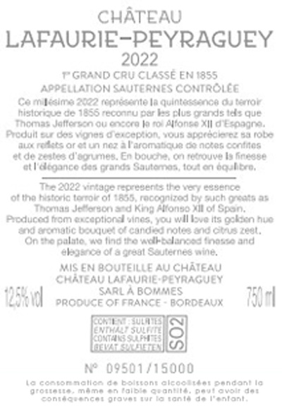 | Libellé | Château Lafaurie-Peyraguey, 2022 - Sauternes AOP - Blanc Moelleux - 75 cl |