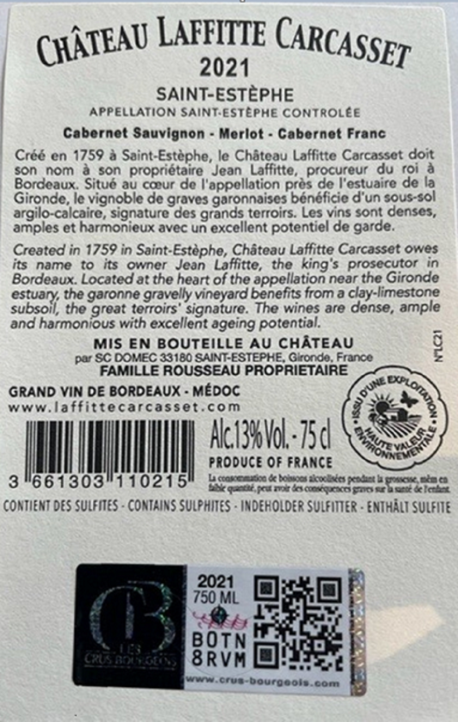 | Libellé | Château Laffitte Carcasset, 2021 - Saint-Estèphe AOP - Rouge - 75 cl |