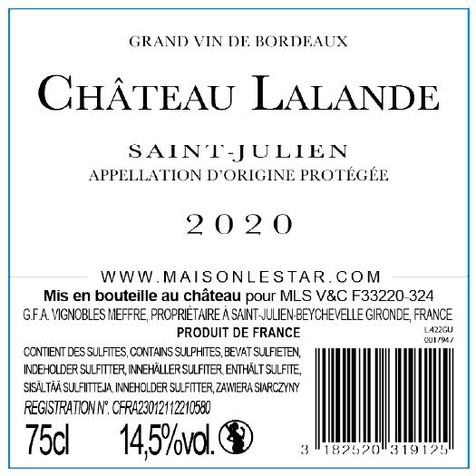 | Libellé | Château Lalande, 2021 - Saint-Julien AOP - Rouge - 75 cl |