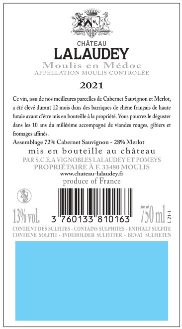 | Libellé | Château Lalaudey, 2021 - Moulis ou Moulis-en-Médoc AOP - Rouge - 75 cl |