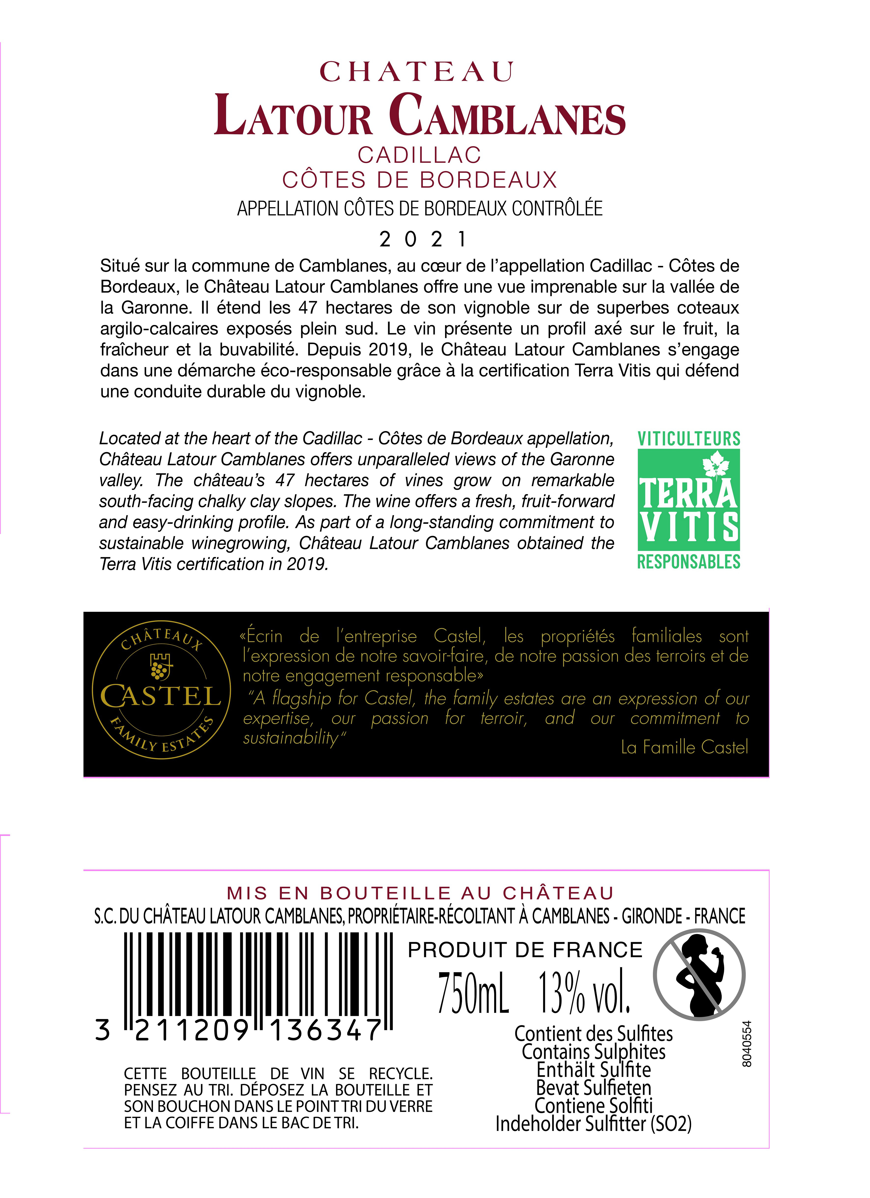 | Libellé | Château Latour Camblanes, 2021 - Cadillac Côtes de Bordeaux AOP - Rouge - 75 cl |