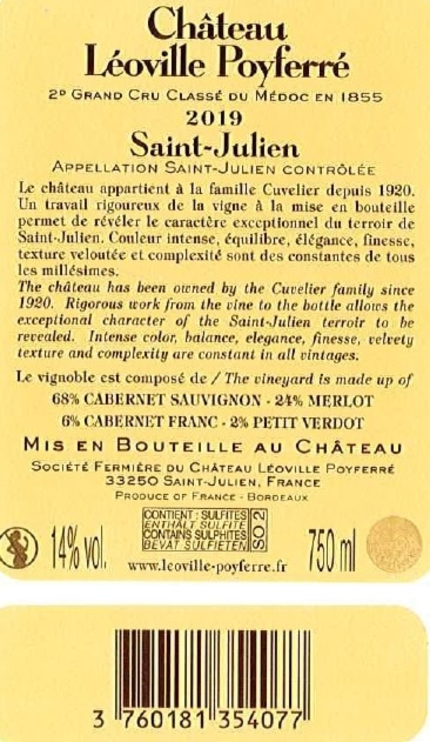 | Libellé | Château Leoville Poyferre, 2019 - Saint-Julien AOP - Rouge - 75 cl |