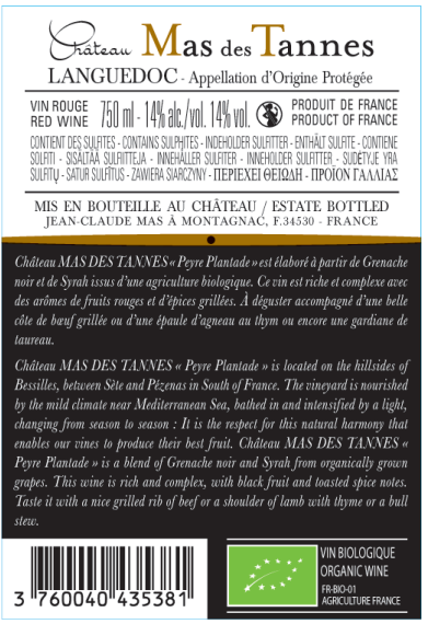 Libellé Château Mas des Tannes Peyre Plantade BIO, 2022 - Languedoc AOP - Rouge - 75 cl