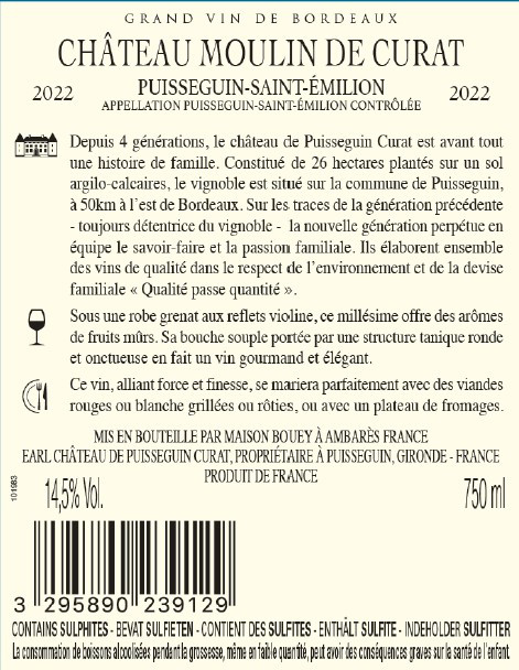 | Libellé | Château Moulin de Curat, 2022 - Puisseguin-Saint-Emilion AOP - Rouge - 75 cl |