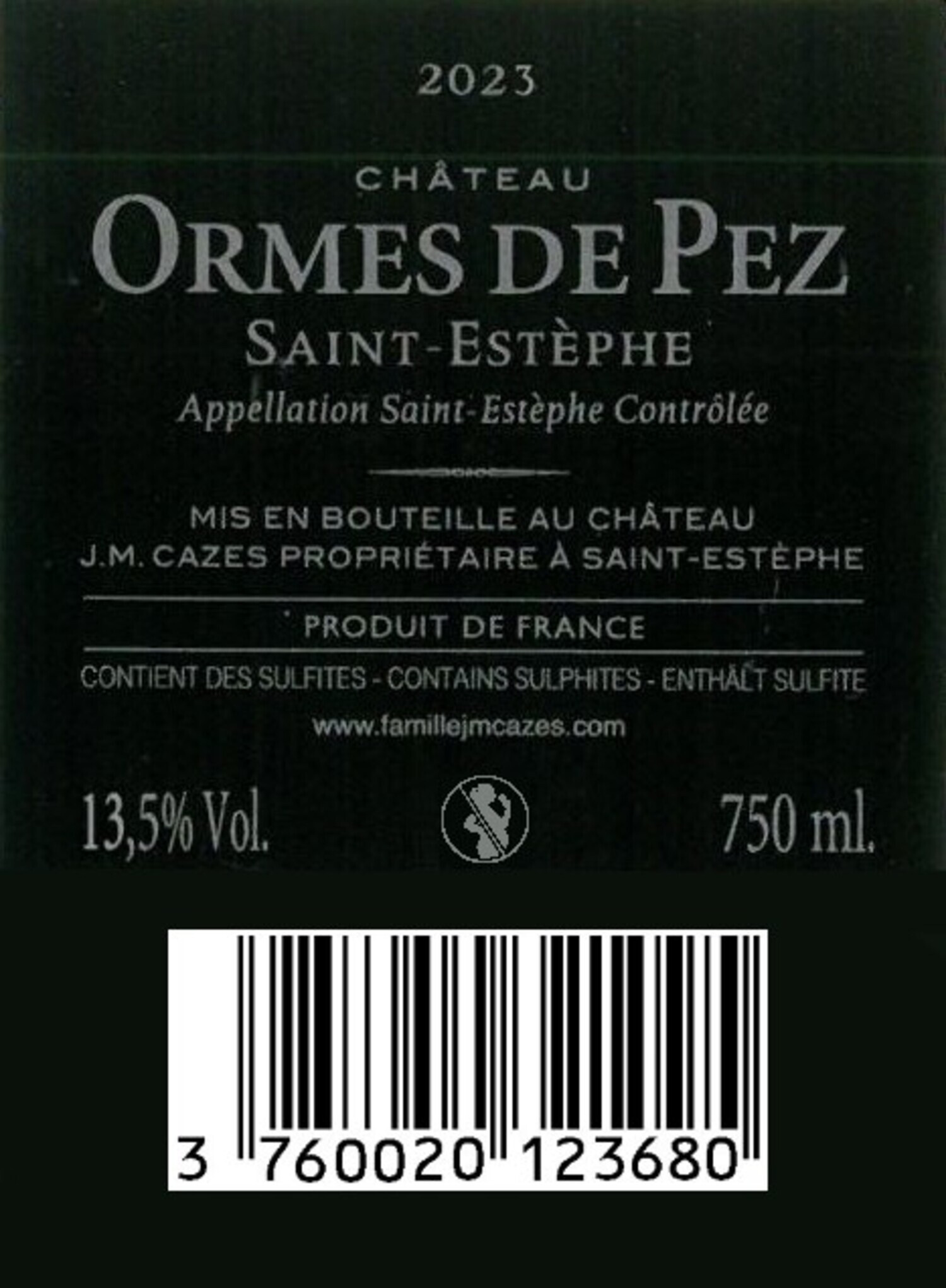 | Libellé | Château Ormes De Pez, 2023 - Saint-Estèphe AOP - Rouge - 75 cl |