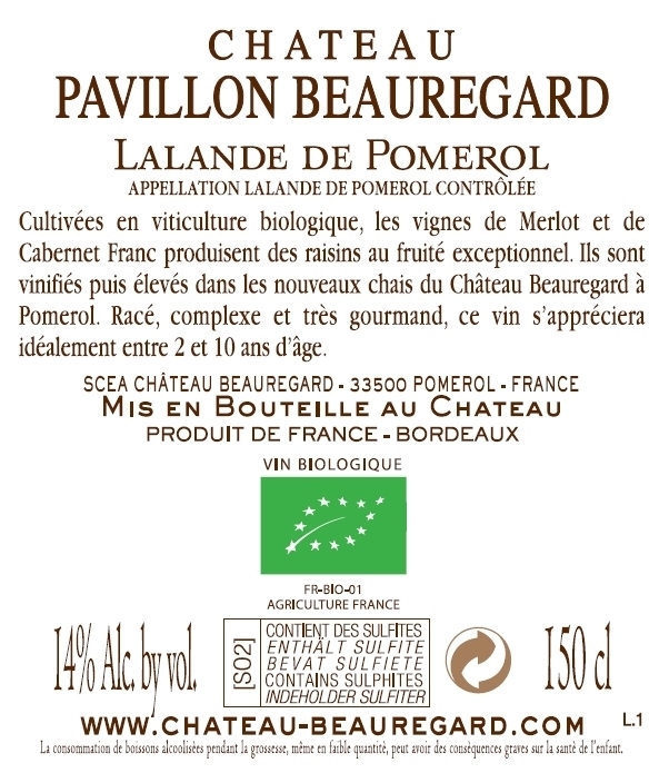 | Libellé | Château Pavillon Beauregard BIO, 2018 - Lalande de Pomerol AOP - Rouge - 75 cl |