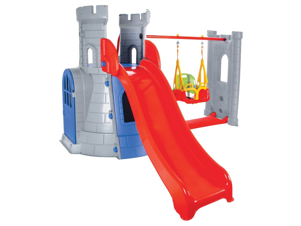 Château pour enfants en plastique avec toboggan et balançoire ENSEMBLE CASTLE SLIDE ET BALANÇOIRE