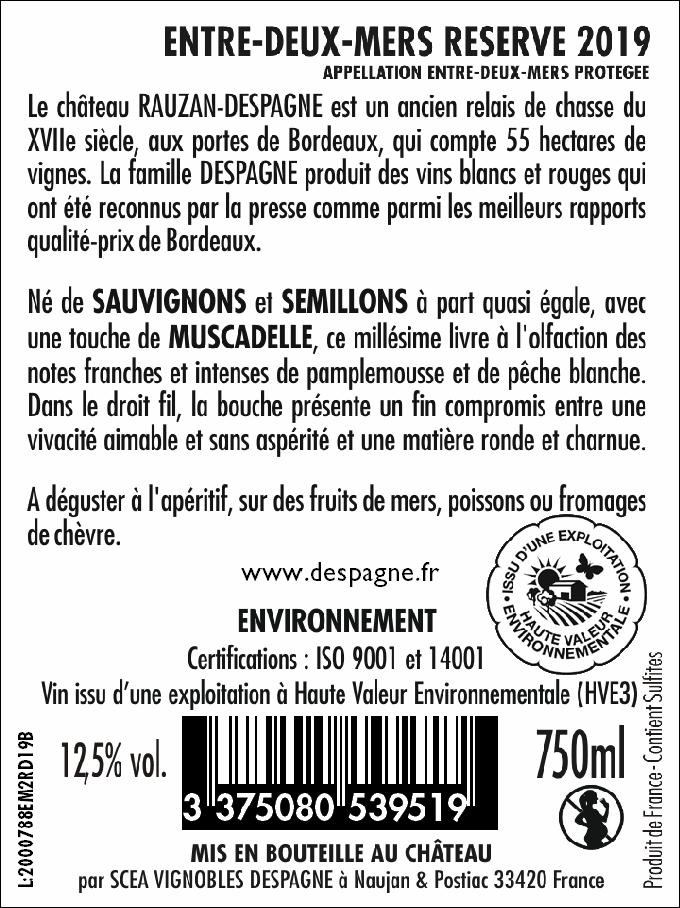 | Libellé | Château Rauzan Despagne, 2019 - Entre-Deux-Mers AOP - Blanc Sec - 75 cl |