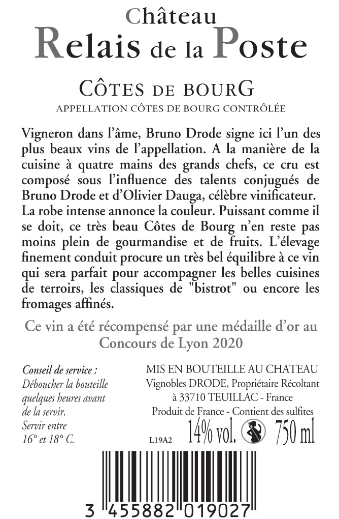 | Libellé | Château Relais de la Poste, 2019 - Côtes de Bourg AOP - Rouge - 75 cl |