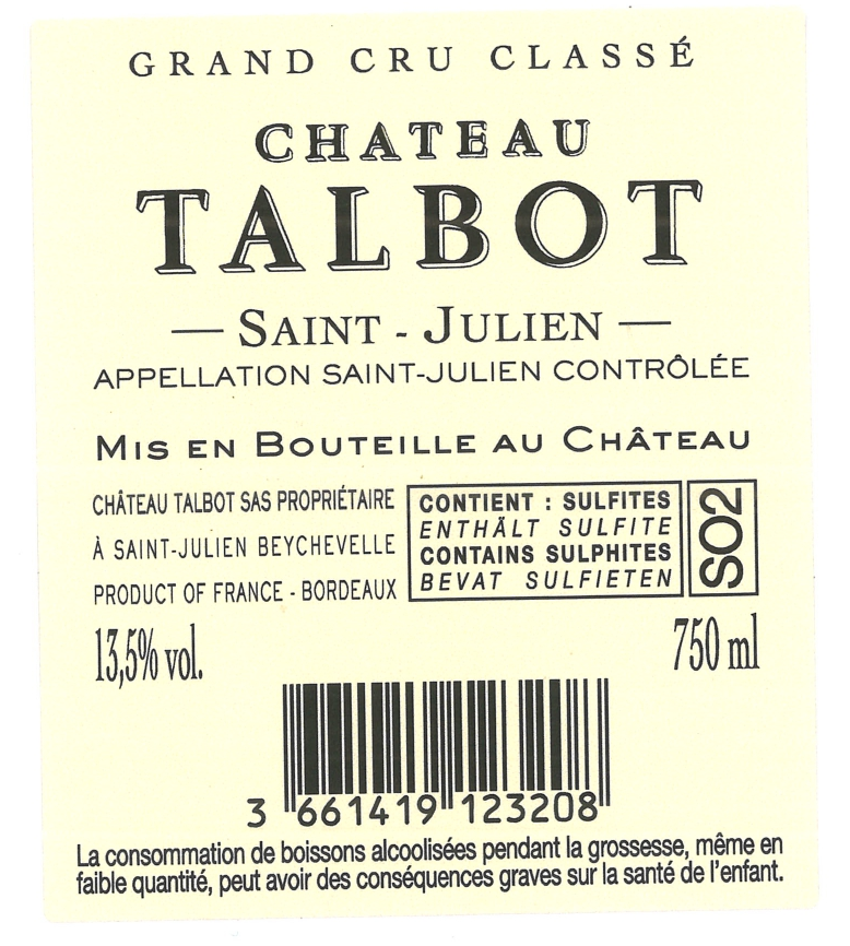 | Libellé | Château Talbot, 2023 - Saint-Julien AOP - Rouge - 75 cl |