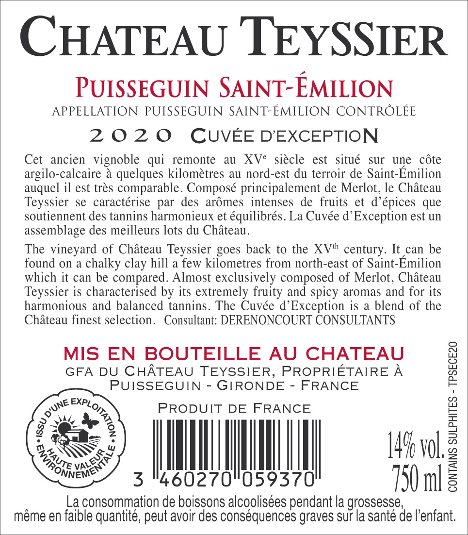| Libellé | Château Teyssier, 2020 - Puisseguin-Saint-Emilion AOP - Rouge - 75 cl |