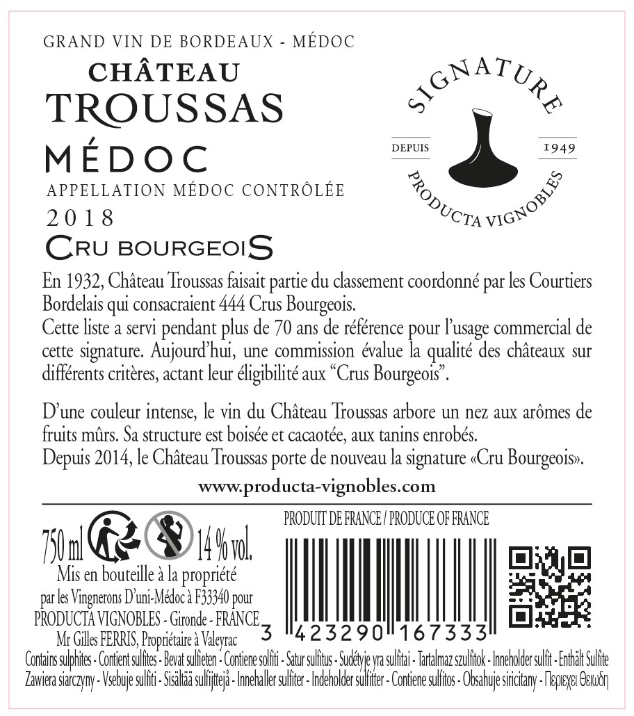 | Libellé | Château Troussas, 2018 - Médoc Cru Bourgeois AOC - Rouge - 75 cl |