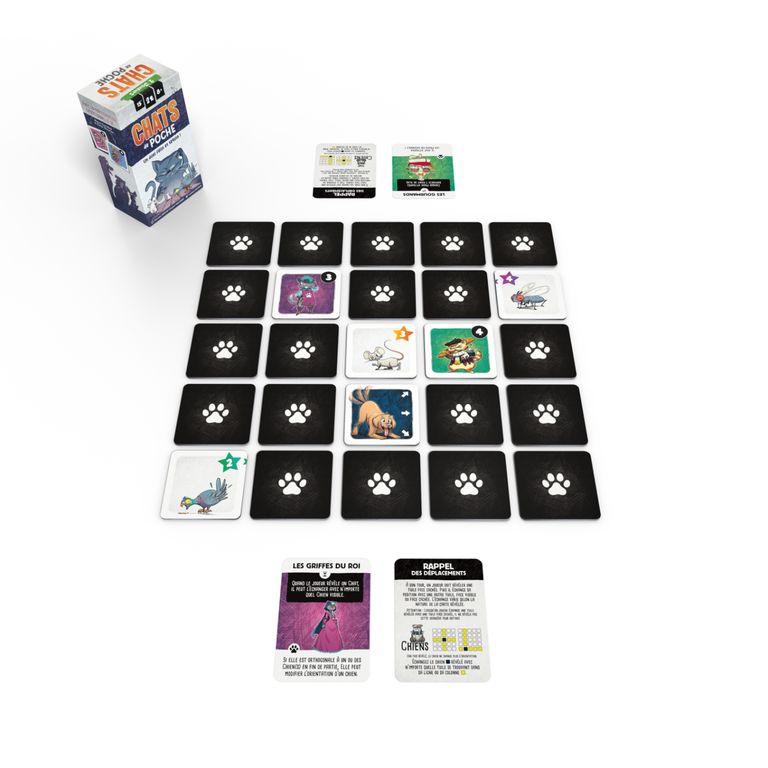 À vous les souris ! Tour à tour, révélez et déplacez les tuiles. Placez les chats de votre bande et attrapez vos proies afin de remporter la partie. Mais.. gare aux chiens !