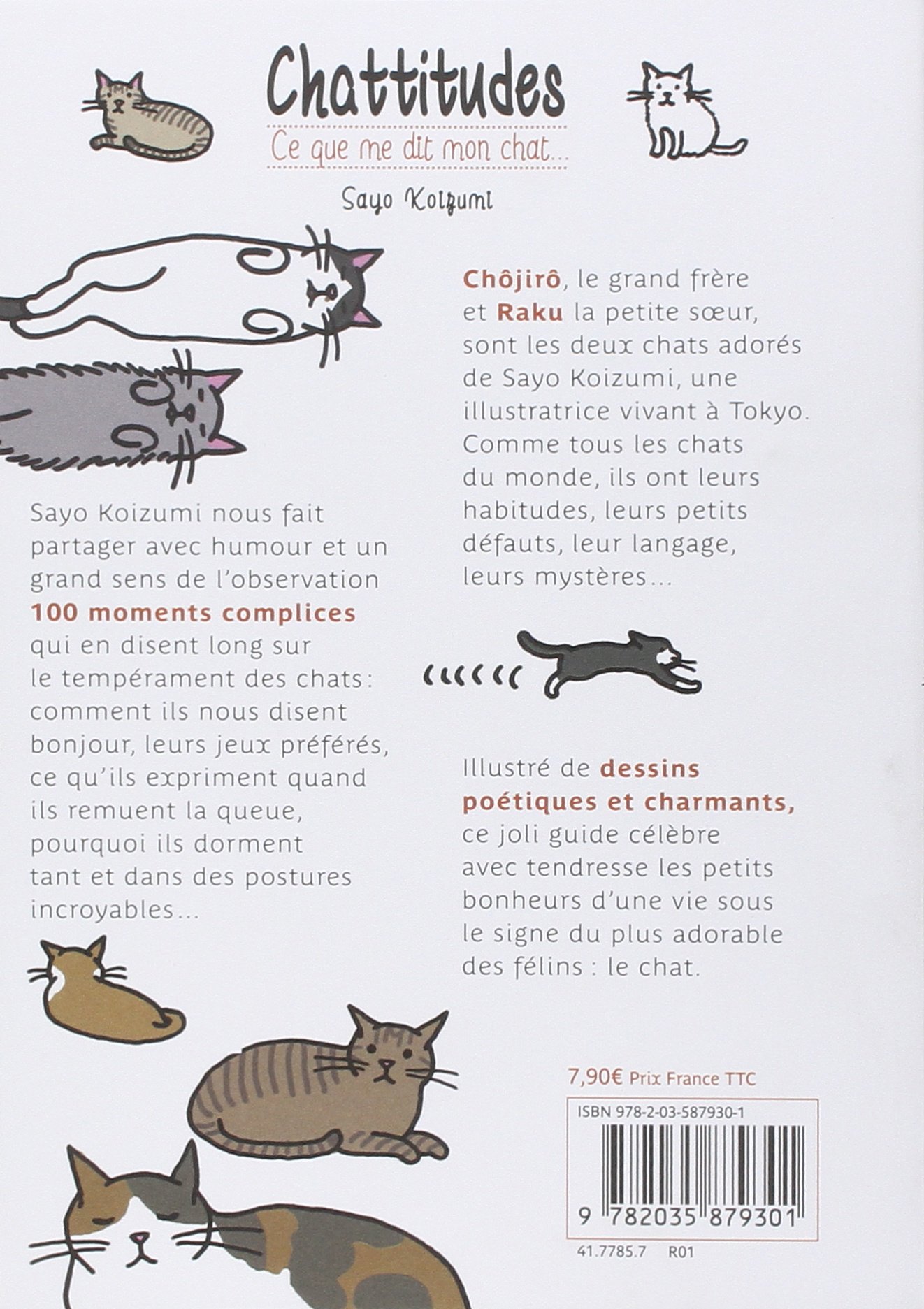 Sayo Koizumi nous fait partager avec humour et un grand sens de l'observation 100 moments complices qui en disent long sur le tempérament des chats : comment ils nous disent bonjour, leurs jeux préférés, ce qu'ils expriment quand ils remuent la queue, pourquoi ils dorment tant et dans des postures incroyables...