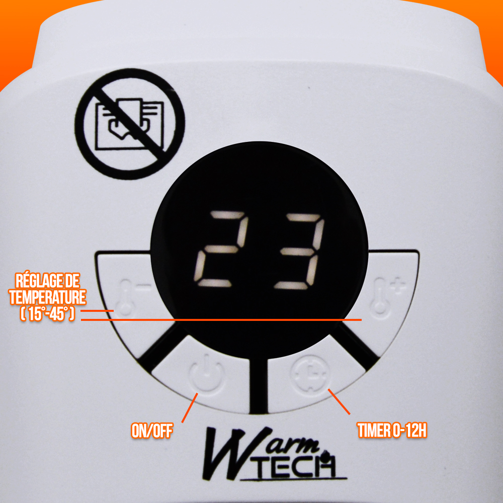 Il est équipé d'un timer 0- 12H et possède une plage de température allant de 15 à 45°.