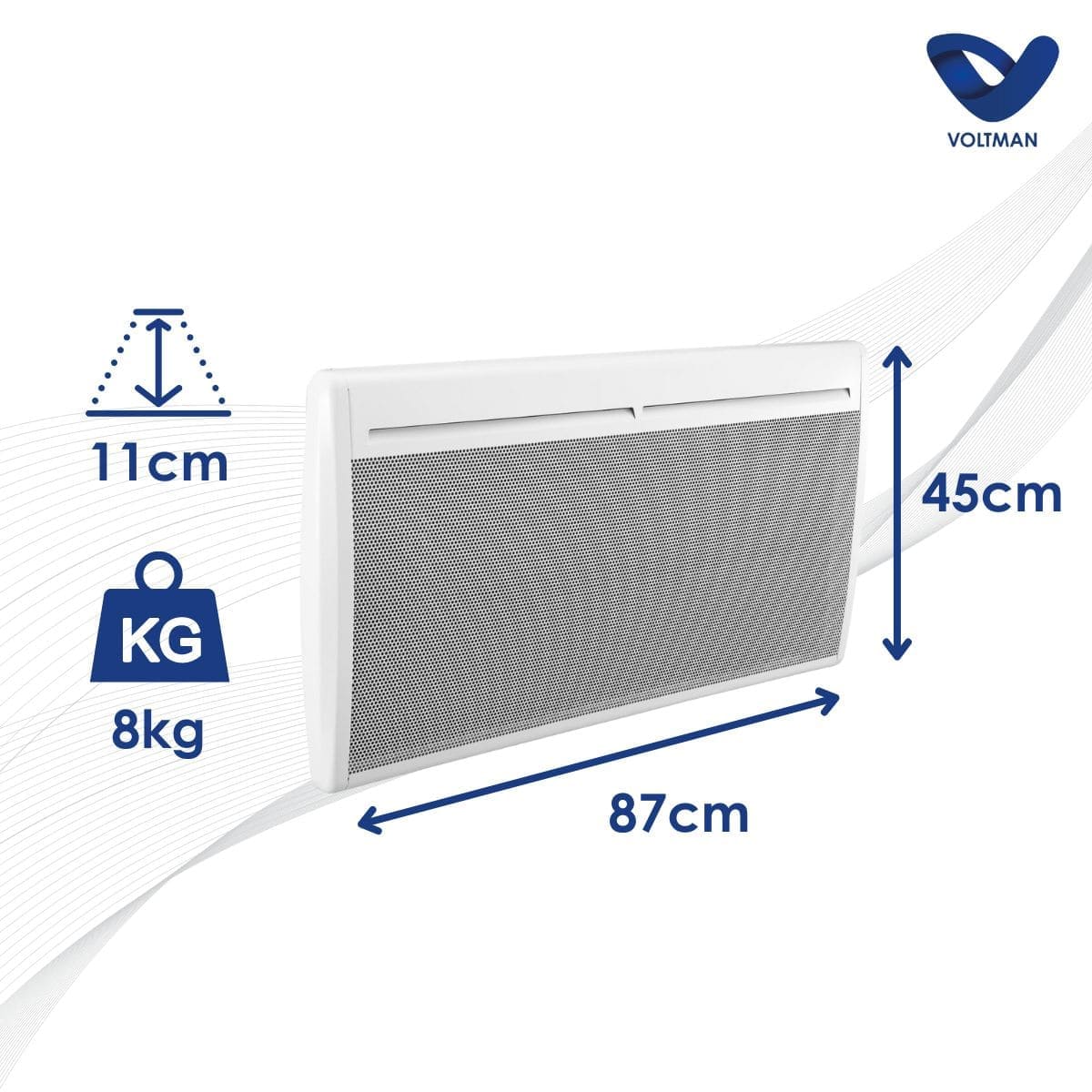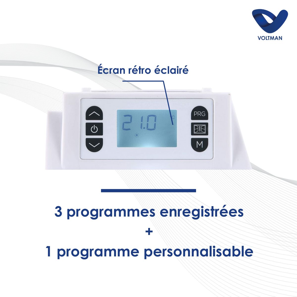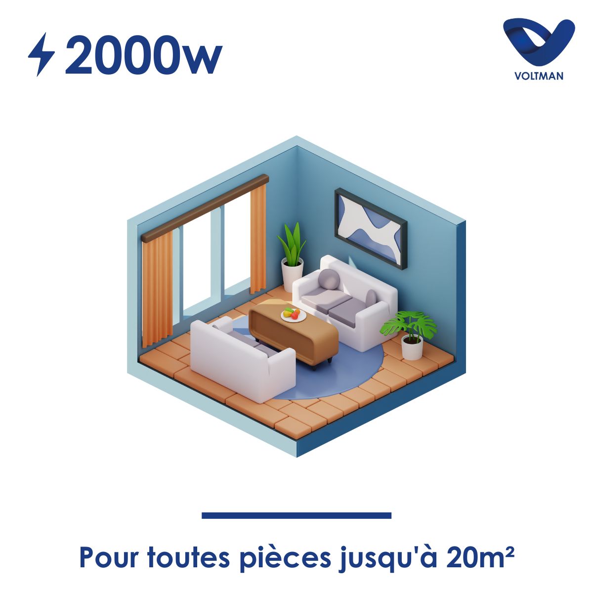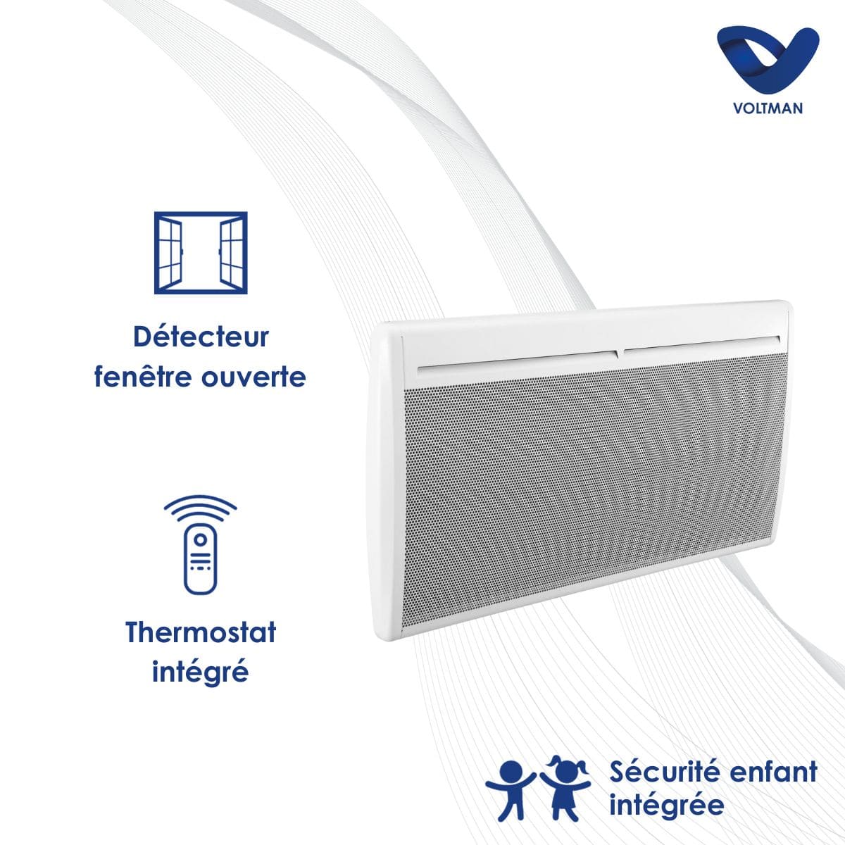 Caractéristiques du chauffage électrique fixe 1000 à 2000W - panneaux rayonnants - blanc - Voltman :