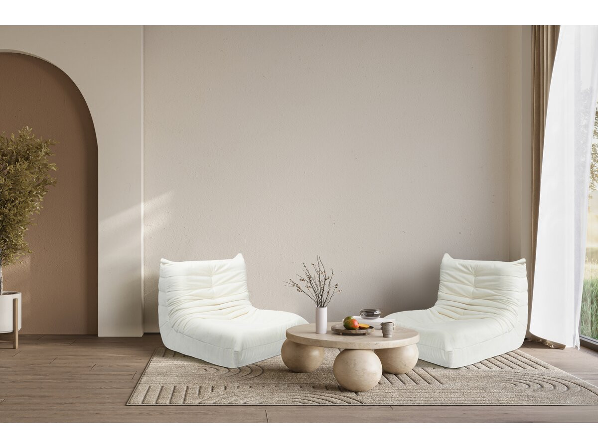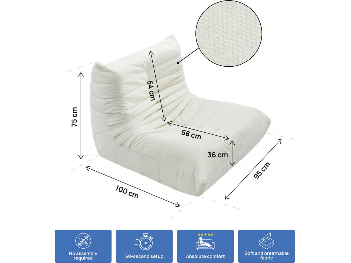 Chauffeuse en tissu texturé "Velasca" - 95 x 100 x 75 cm - Crème Chauffeuse design en velours crême – Élégance et confort absoluCraquez pour cette chauffeuse design en tissu texturé crème, l'alliance parfaite entre style contemporain et confort optimal. Avec sa forme ergonomique et son assise moelleuse, elle invite à la détente tout en apportant une touche sophistiquée à votre décoration intérieure. Ce fauteuil sans accoudoirs au look moderne s'adapte à tous les espaces : salon, chambre ou coin lecture. Son tissu chenille doux et ses finitions soignées en font une pièce maîtresse du mobilier moderne. Facile à déplacer, elle s'intègre aussi bien dans un petit studio que dans un grand séjour. Offrez-vous un moment de relaxation unique avec cette chauffeuse confortable au design intemporel et à la qualité irréprochable. Chauffeuse compressée "Velasca" - Dimensions : 95 x 100 x 75 cm - Grammage du tissu : 300g/m² - Tissu texturé - Crème .Descriptif: Chauffeuse Velasca - Dimensions : 95 x 100 x 75 cm - Grammage du tissu : 300g/m² - Tissu texturé - Blanc