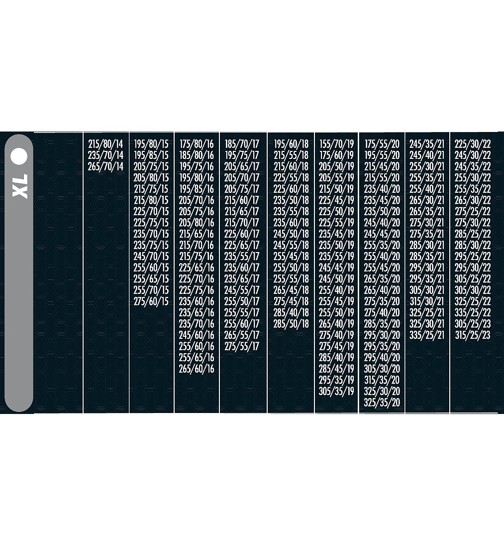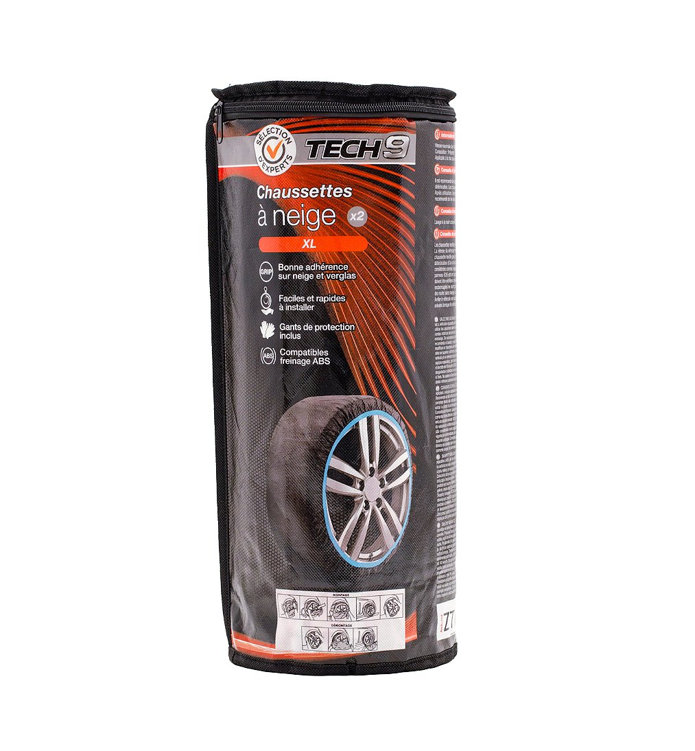 Chaussettes à neige XL TECH9 Bonne adhérence sur neige et verglas Faciles et rapides à installer Gants de protection inclus Compatibles freinage ABS Taille de pneu compatible: 215/80/14, 235/70/14, 265/70/14, 195/80/15, 195/85/15, 205/75/15, 205/80/15, 215/75/15, 215/80/15, 225/70/15, 225/75/15, 235/70/15, 235/75/15,245/70/15, 255/60/15, 255/65/15, 275/60/15, 175/80/16, 185/80/16, 195/75/16, 195/80/16, 195/85/16, 205/70/16, 205/75/16, 215/60/16, 215/65/16, 215/70/16, 215/75/16, 225/65/16, 225/70/16, 225/75/16, 235/60/16, 235/65/15, 235/70/15, 245/60/16, 255/60/16, 255/65/16, 265/60/16, 185/70/17, 195/75/17, 205/65/17, 205/70/17, 205/75/17, 215/60/17, 215/65/17, 215/70/17, 225/65/17, 235/60/17, 235/65/17, 245/55/17, 255/50/17, 255/55/17, 255/60/17, 265/55/17, 275/55/17, 195/60/18, 155/70/19, 175/55/20, 245/35/21, 225/30/22 215/55/18, 175/60/19, 195/55/20, 245/40/21, 245/30/22, 215/60/18, 205/50/19, 215/45/20, 255/30/21, 245/35/22, 225/55/18, 205/55/19, 215/55/20, 255/35/21, 255/30/22 225/60/18, 215/50/19, 235/40/20, 255/40/21, 255/35/22 235/50/18,225/45/19,235/45/20,265/30/21,265/30/22 235/55/18,225/50/19,235/50/20,265/35/21,275/25/22 235/60/18,225/55/19,245/40/20,275/30/21,275/30/22 245/50/18,235/45/19,245/45/20,275/35/21,285/25/22 245/55/18,235/50/19,255/35/20,285/30/21,285/30/22 255/45/18,235/55/19,255/40/20,285/35/21,295/25/22 255/50/18,245/45/19,255/45/20,295/30/21,295/30/22 255/55/18,245/50/19,265/35/20,295/35/21,305/25/22 265/45/18,255/40/19,265/40/20,305/30/21,305/30/22 275/45/18,255/45/19,275/35/20,315/30/21,325/25/22 285/40/18,255/50/19,275/40/20,325/25/21,335/25/22 285/50/18,265/40/19,285/35/20,325/30/21,305/25/23 ,275/40/19,295/30/20,335/25/21,315/25/23 ,285/40/19,295/35/20,, ,285/45/19,295/40/20,, ,295/35/19,305/30/20,, ,305/35/19,305/35/20,, ,,315/30/20,, ,,325/30/20,, ,,325/35/20,,