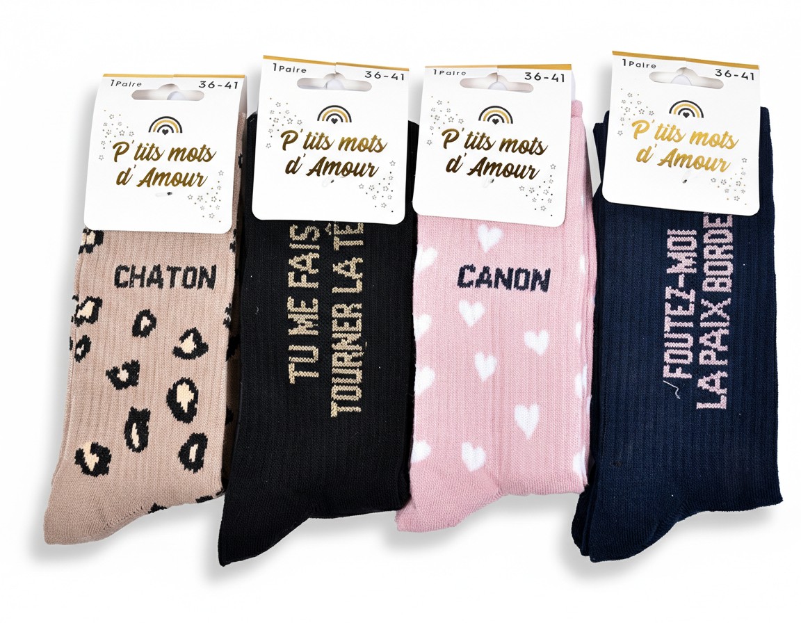 Succombez au charme irrésistible des chaussettes femme lurex, l’accessoire qui combine mode, humour et éclat. Leur fil lurex brillant capte la lumière avec élégance, apportant un effet pailleté subtil, parfait pour les amatrices de looks modernes et féminins. Chaque paire véhicule un petit message drôle et complice, pour affirmer son humeur ou sa personnalité avec légèreté. Idéales à offrir, ces chaussettes sont livrées dans un blister raffiné “P’tits mots d’Amour” et se transforment en une excellente idée cadeau pour toutes les occasions : Saint-Valentin, Noël, fête des mères, ou simplement pour faire sourire. Disponibles en taille unique femme 36/41, elles assurent un confort optimal, une bonne élasticité et un touché doux agréable à porter. Un indispensable du dressing féminin, aussi pétillant que confortable !