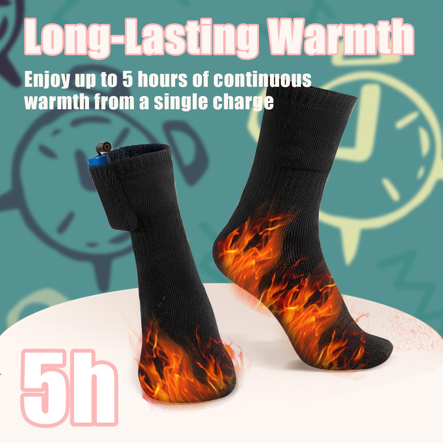 Chaleur longue durée : Profitez jusqu'à 5 heures de chaleur continue avec une seule charge, ce qui rend ces chaussettes thermiques parfaites pour les activités de plein air plus longues par temps froid.