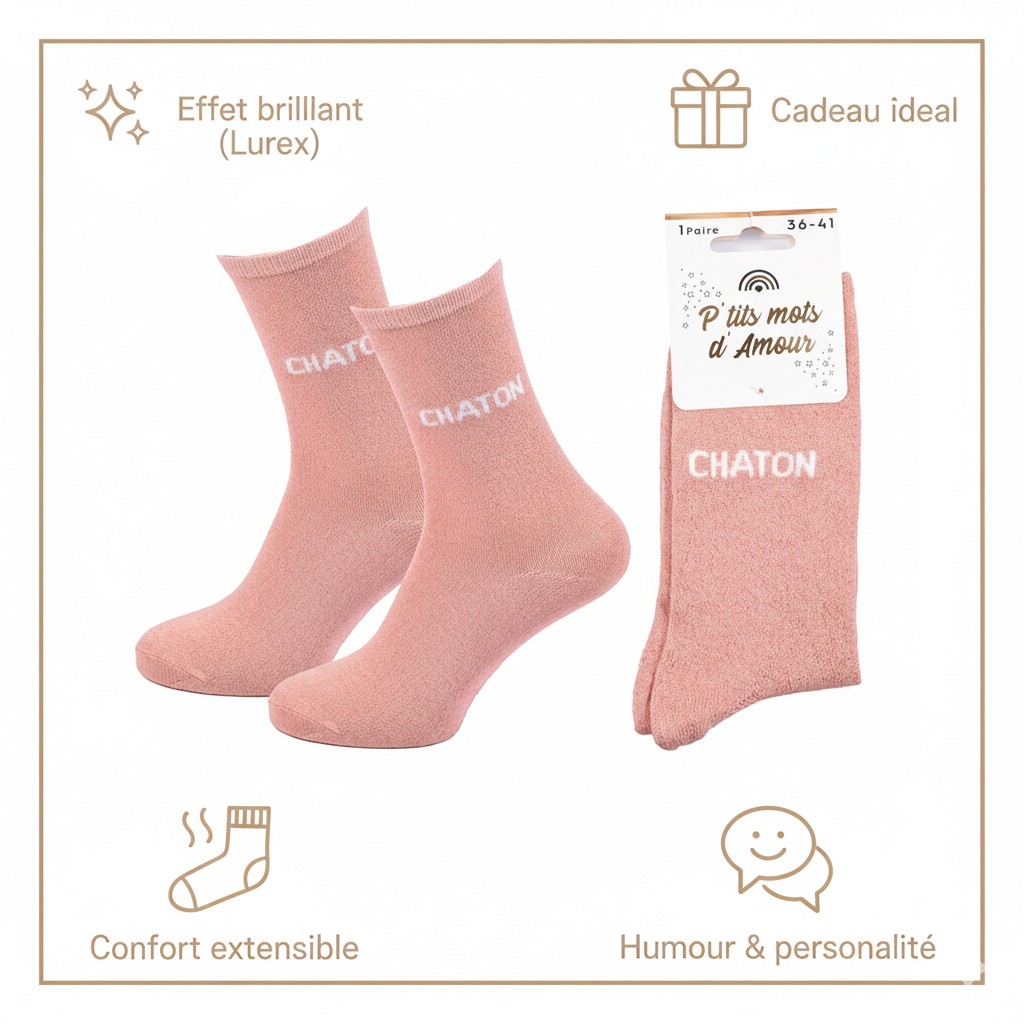 Succombez au charme irrésistible des chaussettes femme lurex, l’accessoire qui combine mode, humour et éclat. Leur fil lurex brillant capte la lumière avec élégance, apportant un effet pailleté subtil, parfait pour les amatrices de looks modernes et féminins. Chaque paire véhicule un petit message drôle et complice, pour affirmer son humeur ou sa personnalité avec légèreté. Idéales à offrir, ces chaussettes sont livrées dans un blister raffiné “P’tits mots d’Amour” et se transforment en une excellente idée cadeau pour toutes les occasions : Saint-Valentin, Noël, fête des mères, ou simplement pour faire sourire. Disponibles en taille unique femme 36/41, elles assurent un confort optimal, une bonne élasticité et un touché doux agréable à porter. Un indispensable du dressing féminin, aussi pétillant que confortable !