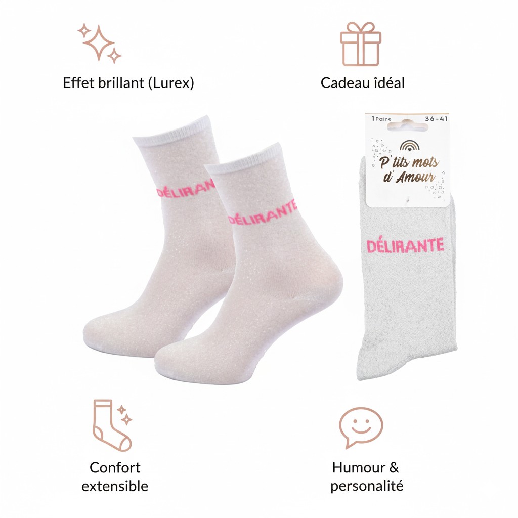 Succombez au charme irrésistible des chaussettes femme lurex, l’accessoire qui combine mode, humour et éclat. Leur fil lurex brillant capte la lumière avec élégance, apportant un effet pailleté subtil, parfait pour les amatrices de looks modernes et féminins. Chaque paire véhicule un petit message drôle et complice, pour affirmer son humeur ou sa personnalité avec légèreté. Idéales à offrir, ces chaussettes sont livrées dans un blister raffiné “P’tits mots d’Amour” et se transforment en une excellente idée cadeau pour toutes les occasions : Saint-Valentin, Noël, fête des mères, ou simplement pour faire sourire. Disponibles en taille unique femme 36/41, elles assurent un confort optimal, une bonne élasticité et un touché doux agréable à porter. Un indispensable du dressing féminin, aussi pétillant que confortable !