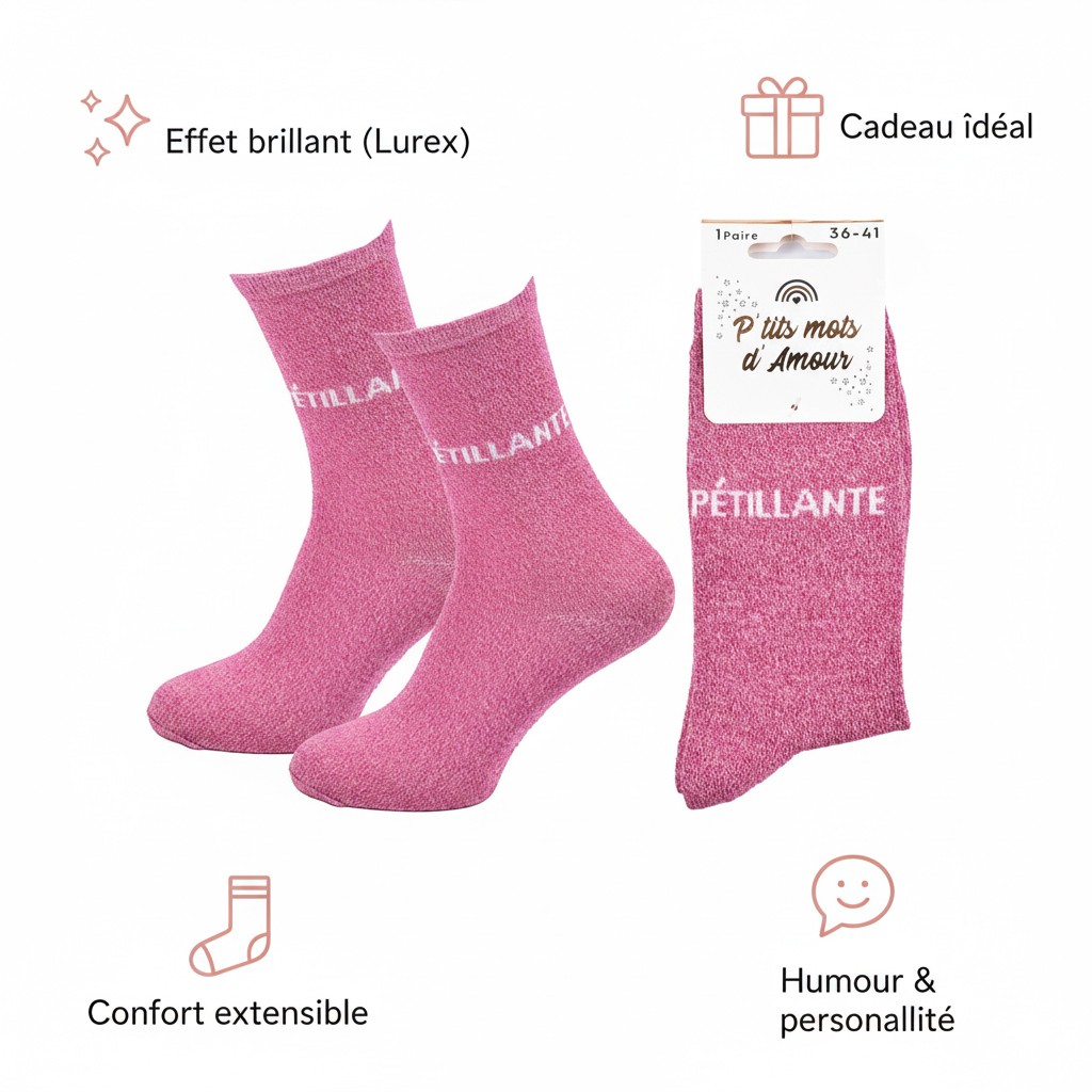 Succombez au charme irrésistible des chaussettes femme lurex, l’accessoire qui combine mode, humour et éclat. Leur fil lurex brillant capte la lumière avec élégance, apportant un effet pailleté subtil, parfait pour les amatrices de looks modernes et féminins. Chaque paire véhicule un petit message drôle et complice, pour affirmer son humeur ou sa personnalité avec légèreté. Idéales à offrir, ces chaussettes sont livrées dans un blister raffiné “P’tits mots d’Amour” et se transforment en une excellente idée cadeau pour toutes les occasions : Saint-Valentin, Noël, fête des mères, ou simplement pour faire sourire. Disponibles en taille unique femme 36/41, elles assurent un confort optimal, une bonne élasticité et un touché doux agréable à porter. Un indispensable du dressing féminin, aussi pétillant que confortable !