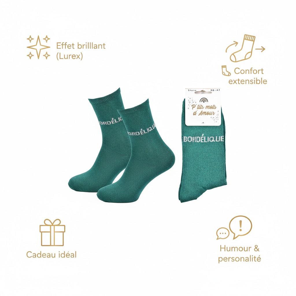 Succombez au charme irrésistible des chaussettes femme lurex, l’accessoire qui combine mode, humour et éclat. Leur fil lurex brillant capte la lumière avec élégance, apportant un effet pailleté subtil, parfait pour les amatrices de looks modernes et féminins. Chaque paire véhicule un petit message drôle et complice, pour affirmer son humeur ou sa personnalité avec légèreté. Idéales à offrir, ces chaussettes sont livrées dans un blister raffiné “P’tits mots d’Amour” et se transforment en une excellente idée cadeau pour toutes les occasions : Saint-Valentin, Noël, fête des mères, ou simplement pour faire sourire. Disponibles en taille unique femme 36/41, elles assurent un confort optimal, une bonne élasticité et un touché doux agréable à porter. Un indispensable du dressing féminin, aussi pétillant que confortable !