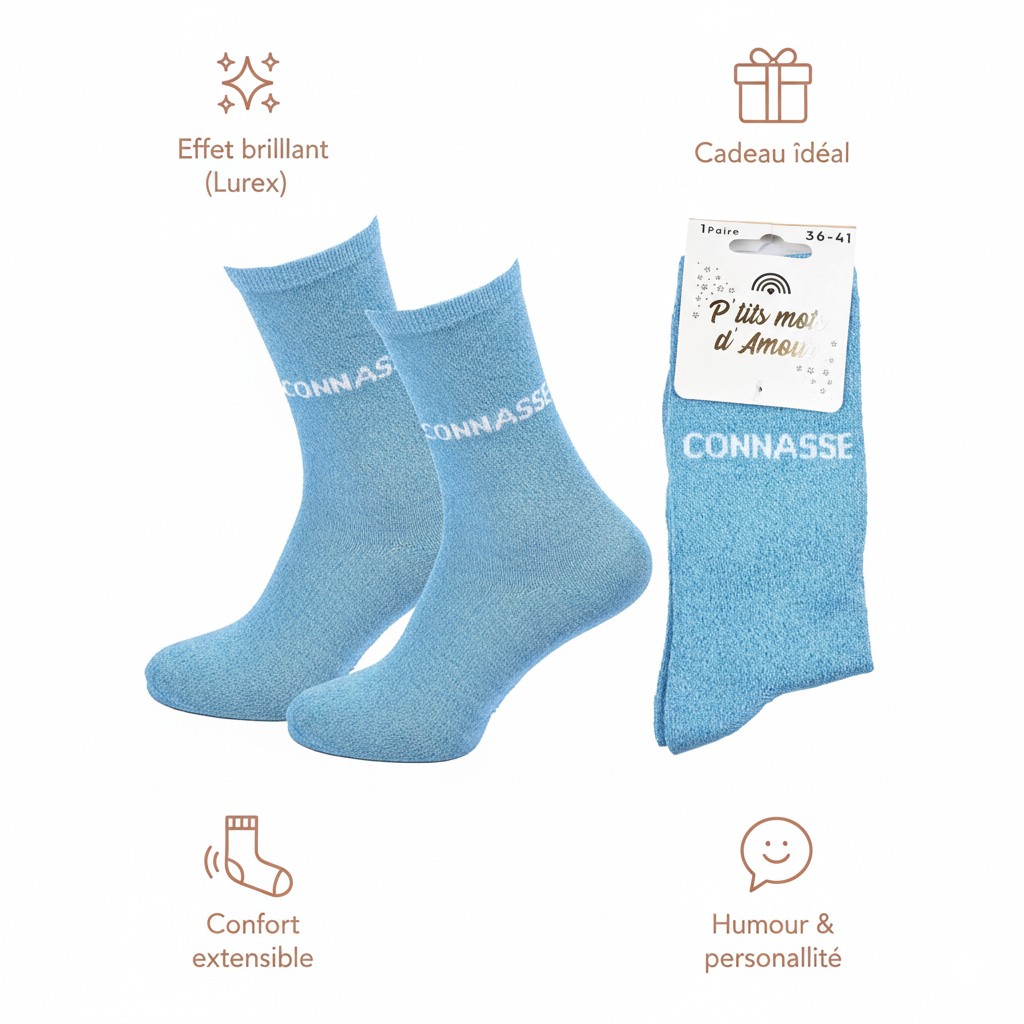 Succombez au charme irrésistible des chaussettes femme lurex, l’accessoire qui combine mode, humour et éclat. Leur fil lurex brillant capte la lumière avec élégance, apportant un effet pailleté subtil, parfait pour les amatrices de looks modernes et féminins. Chaque paire véhicule un petit message drôle et complice, pour affirmer son humeur ou sa personnalité avec légèreté. Idéales à offrir, ces chaussettes sont livrées dans un blister raffiné “P’tits mots d’Amour” et se transforment en une excellente idée cadeau pour toutes les occasions : Saint-Valentin, Noël, fête des mères, ou simplement pour faire sourire. Disponibles en taille unique femme 36/41, elles assurent un confort optimal, une bonne élasticité et un touché doux agréable à porter. Un indispensable du dressing féminin, aussi pétillant que confortable !